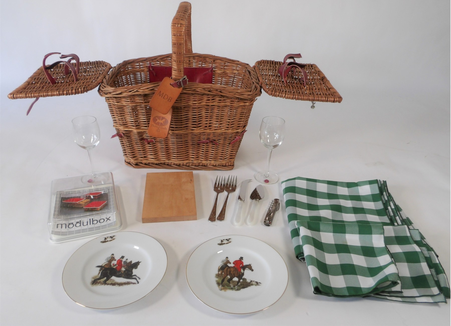 This basket comes with everything you need for a nice picnic. 2 Thomas B. Swain plates, 2 wine glasses, 1 cheese board, a corkscrew/bottle opener, silverware, 1 modulbox, and a tablecloth and 2 napkins. Red straps hold everything in. Fancy French Horn closure on top. 16 inches long. 17 inches tall.