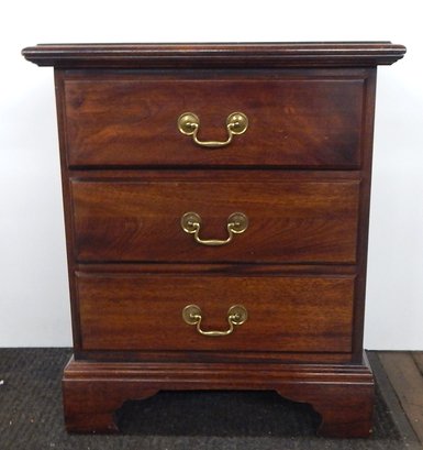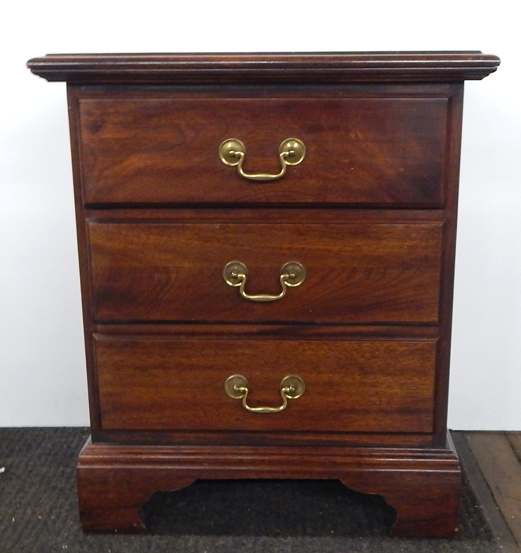 Side table by Thomasville in walnut finish, three drawers with brass handles
