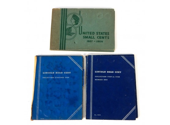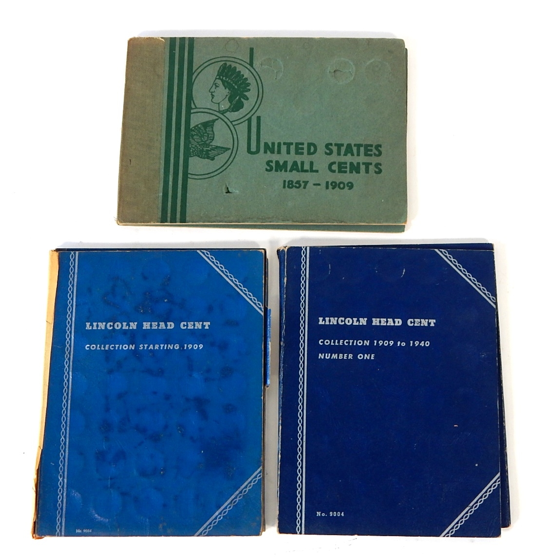 Three incomplete cent collection folders: Indian heads and earlier wheat pennies.