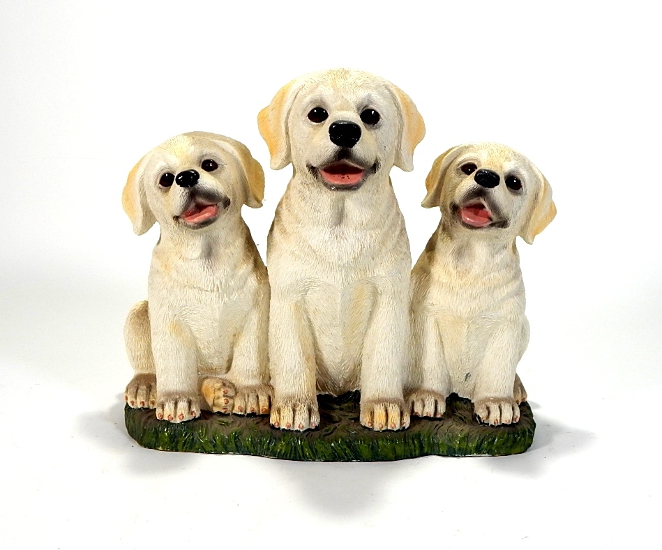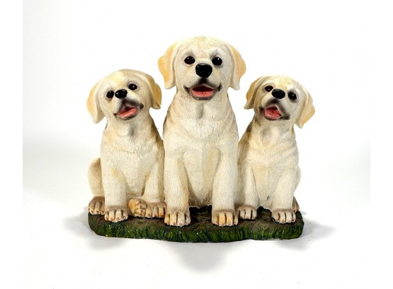 Adorable 3 dogs porch or garden statue made of some composite or plastic.