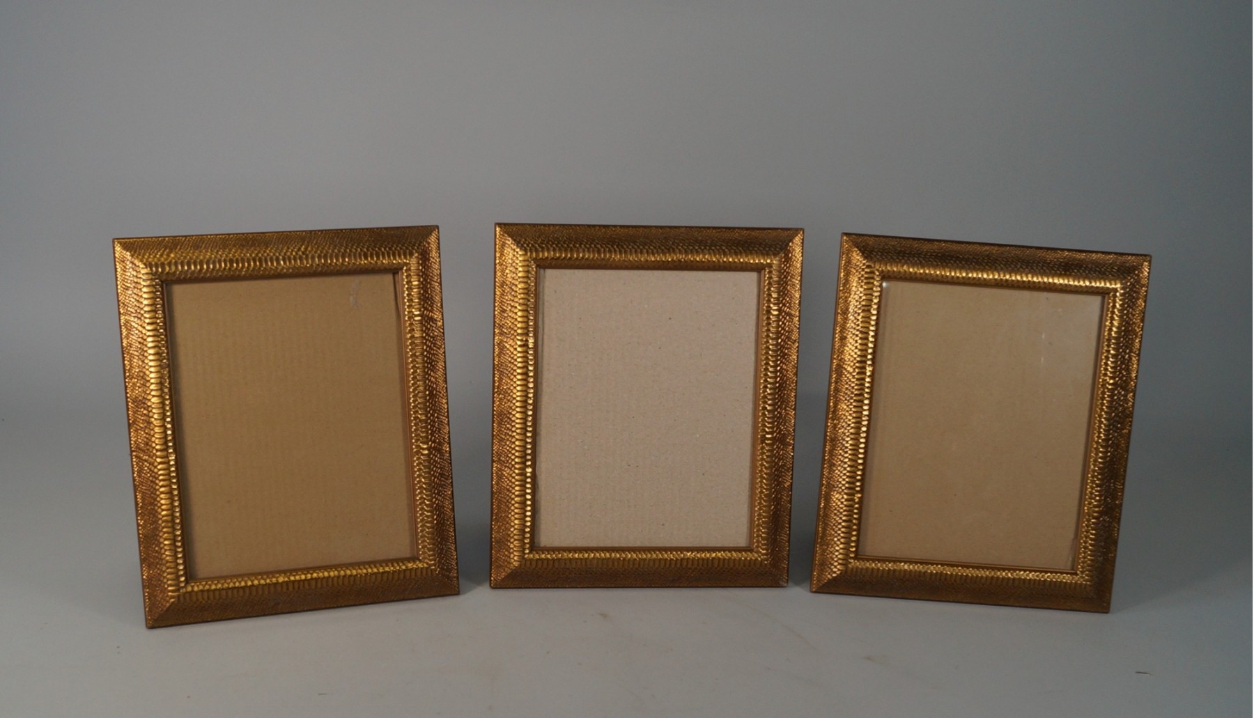 Listed are 3 matching picture frames in a gold tone snakeskin motif. They measure 10.5" x 12.5". One frame is missing glass. All in very good used condition.