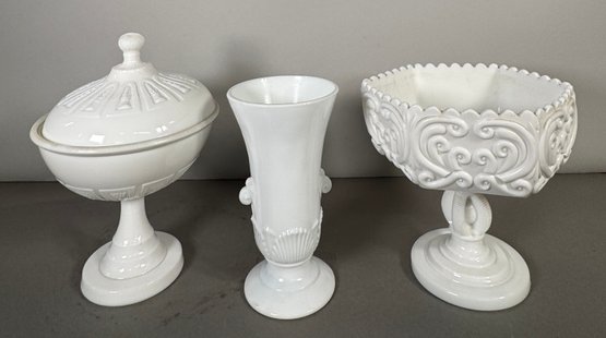 Collection of three white milk glass decorative pieces from the Vtirock Milk Glass collection. Marked "Vitcrock" on the bottom. Includes a covered compote, a vase, and a footed bowl. The compote is approximately 9.5 inches tall with the lid.