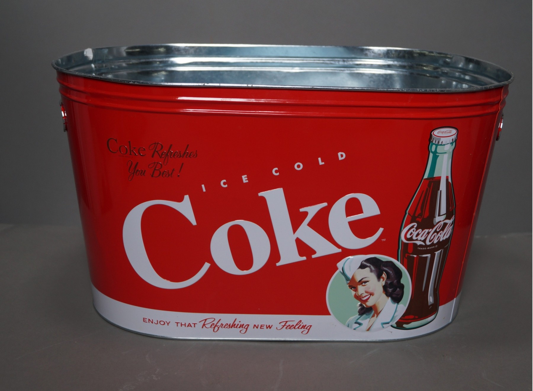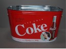 Listed is a new ice bucket made of tin with Coca-Cola imagery. It has open handles on each side. It measures 9"h x 16" long. In very good condition.