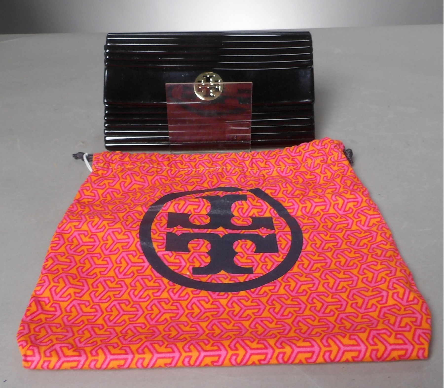Lovely black shiny plastic clutch bag. Emblem on the front. Comes with dust bag.