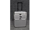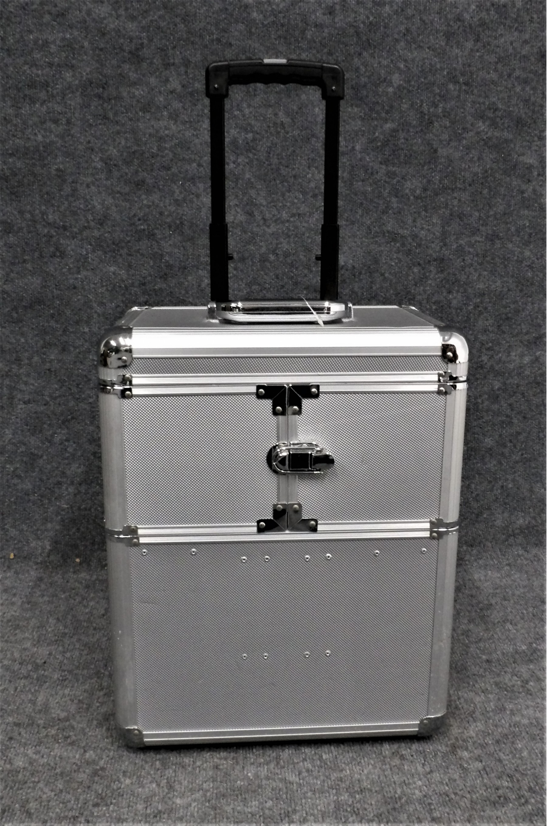 Listed is metal case on wheels measuring 18.5"h x 14.5"w x 9.5"d. The top comes off exposing open drawers that fold out to display your items. All interior parts are very compact in this sturdy case. Wheels move smoothly. Condition is very good. See photos for details.