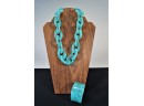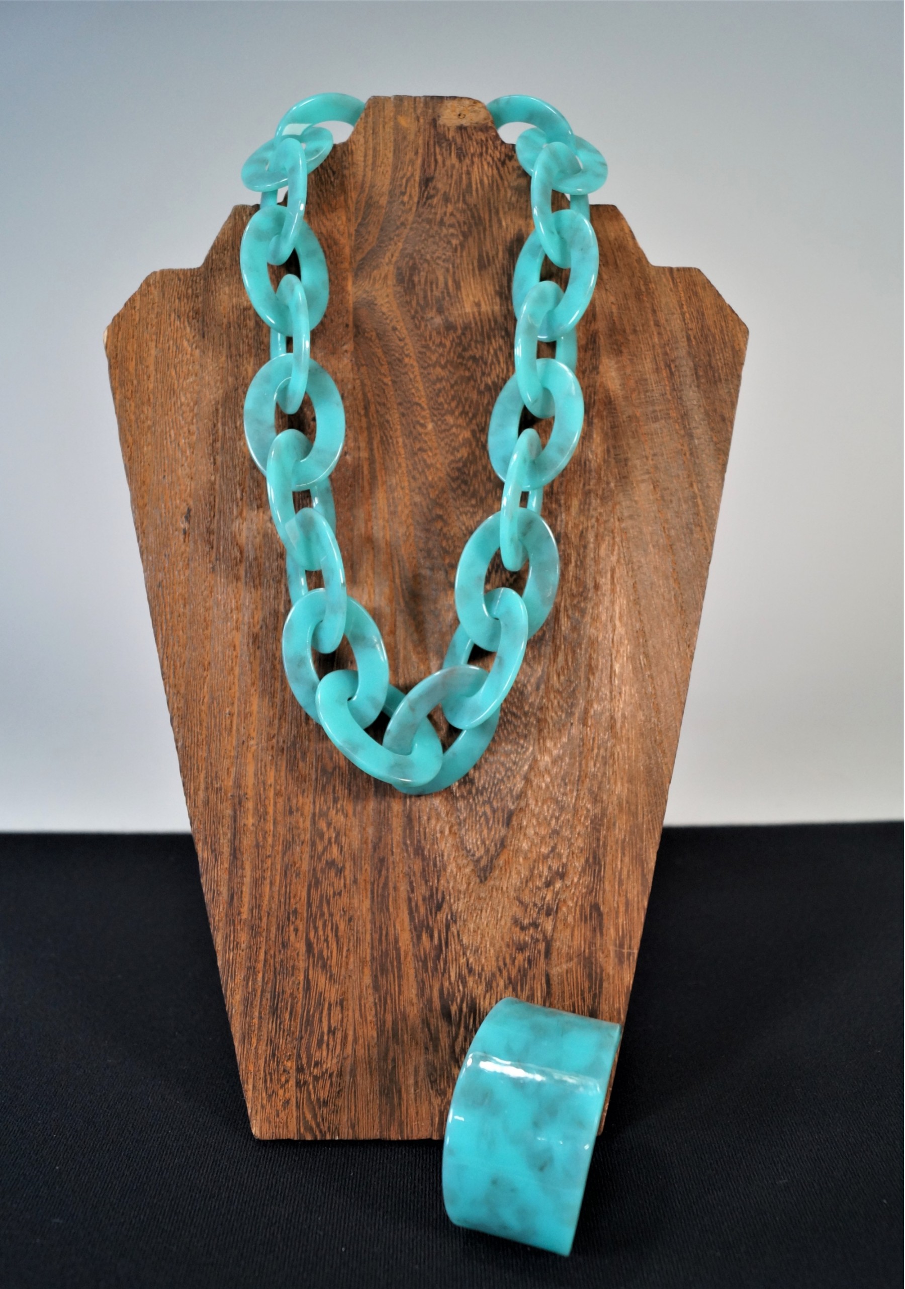 Listed is a plastic necklace with large flat links and a spring circle gold tone clasp. It is a slightly mottled turquoise color. It measures 21" long overall. The matching cuff bracelet measures about 1.5" wide. Both in very good condition. Please see photos for details.