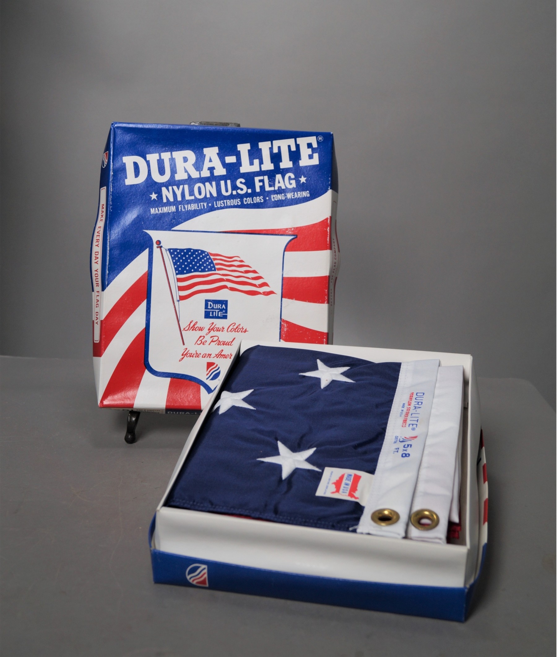 Listed are 2 American outdoor flags made by Dura Lite. In pristine, unused condition. The boxes show some damage. Each flag measures 5' x 8'. See photos.