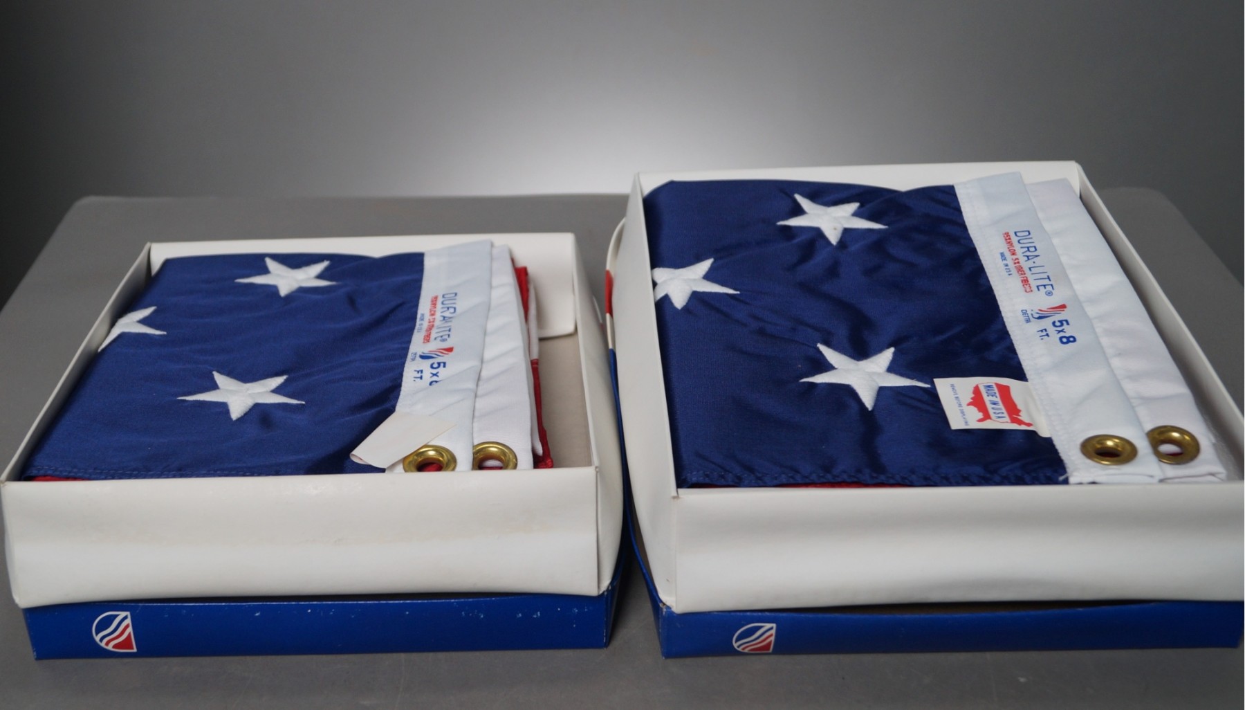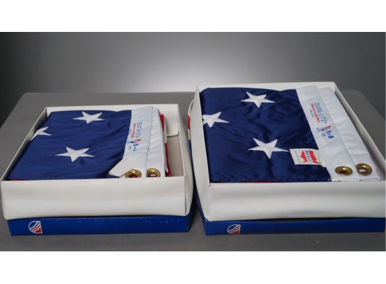 Listed are 2 American outdoor flags made by Dura Lite. In pristine, unused condition. The boxes show some minor damage. Each flag measures 5' x 8'. See photos.