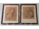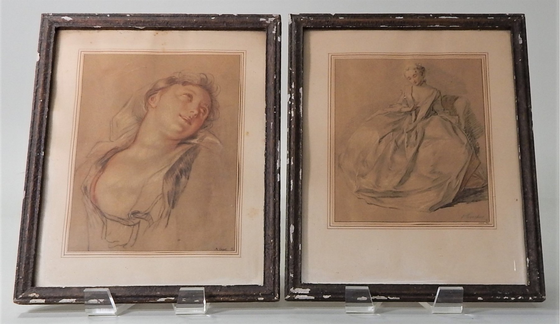 Listed are two antique prints of pastel drawings of women. The prints are in good condition, however the frames are chipped and the mats have darkened. They measure 15"h x 12"w. See photos for details.