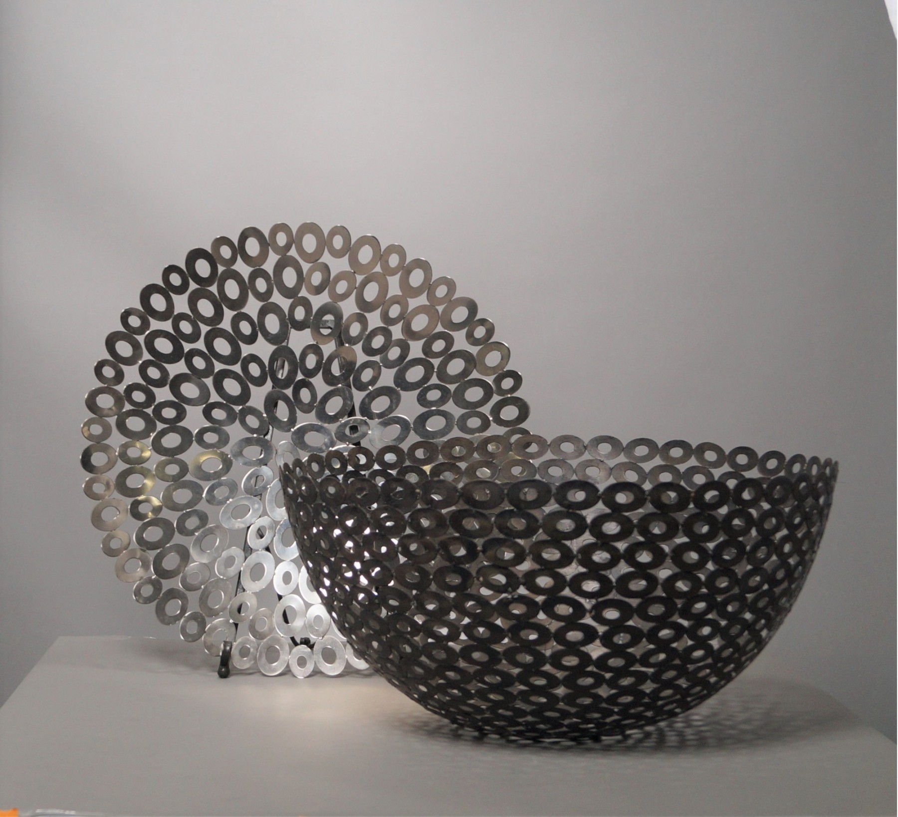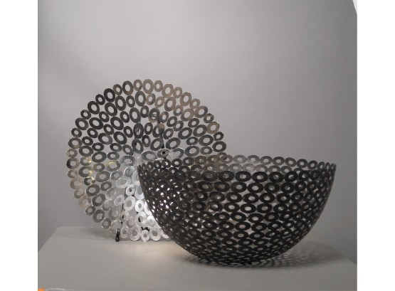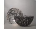 Listed are two metal bowls. The larger one with a bronze finish measure 18" dia. x 9"h, the smaller one with a chrome finish measures 17.5" dia. x 3"h. Both are in very good condition.