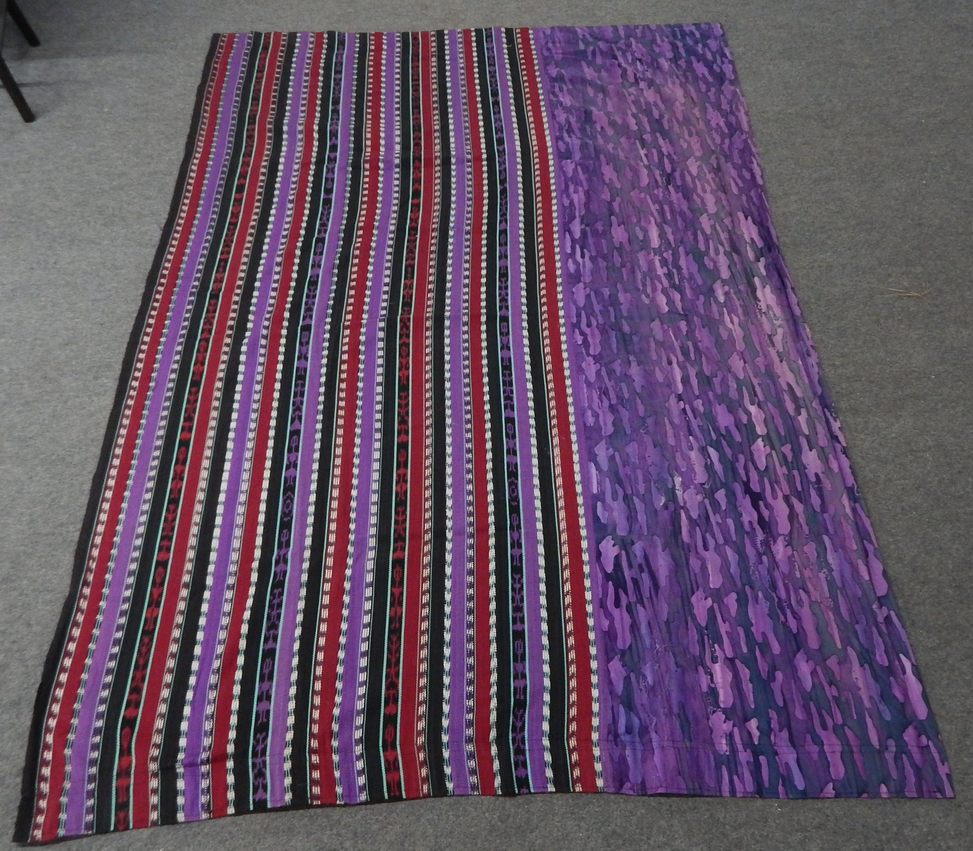 Each panel measures 80"l x 53"w. The cotton batik panel measures 20"w, the striped fabric measures 33"w