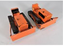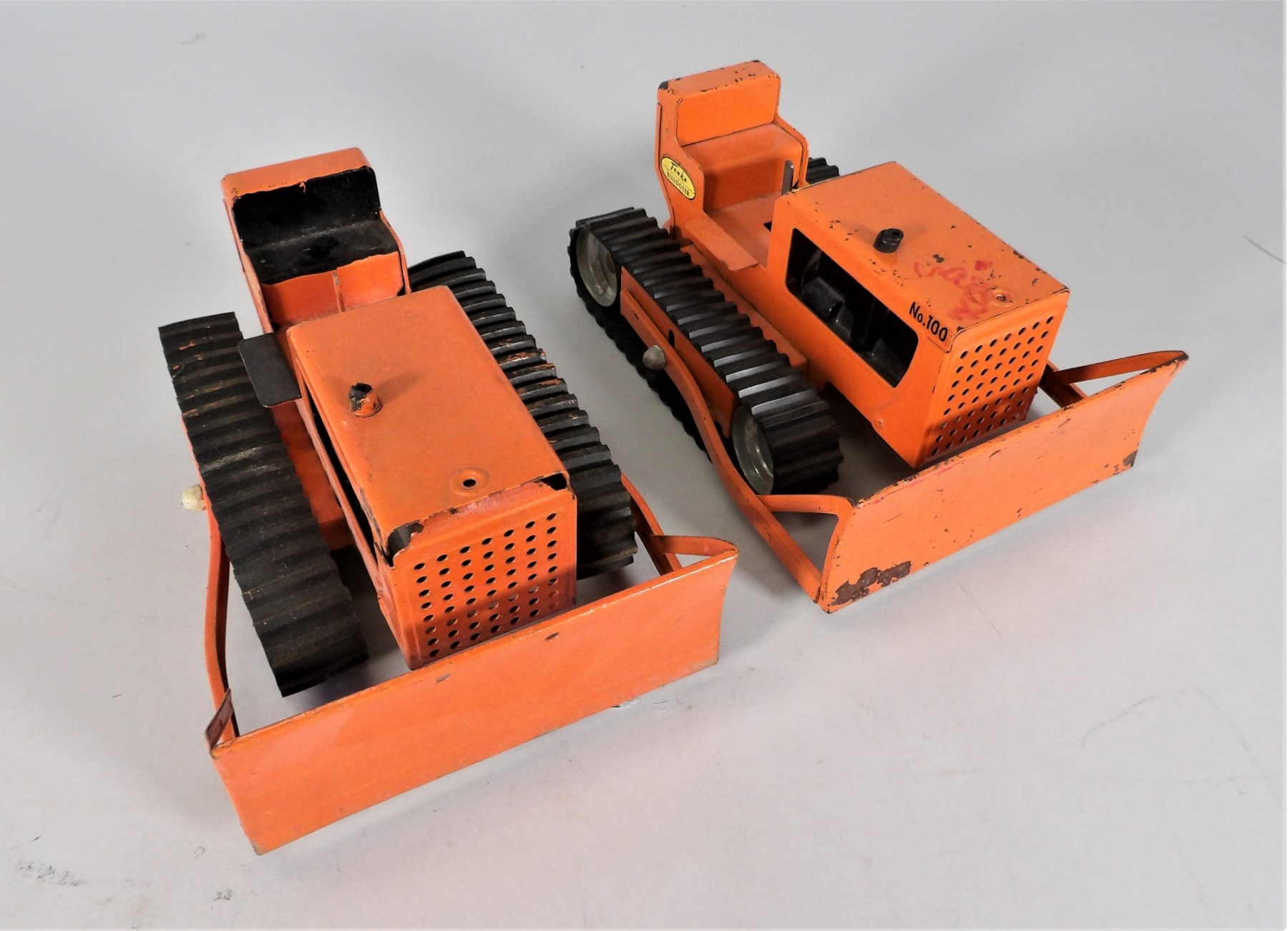 Listed are 2 Tonka bulldozers No.100 measuring 9" in length x 6"wide. There is some paint loss, but both are in very good shape and ready for years of play. See photos for details.