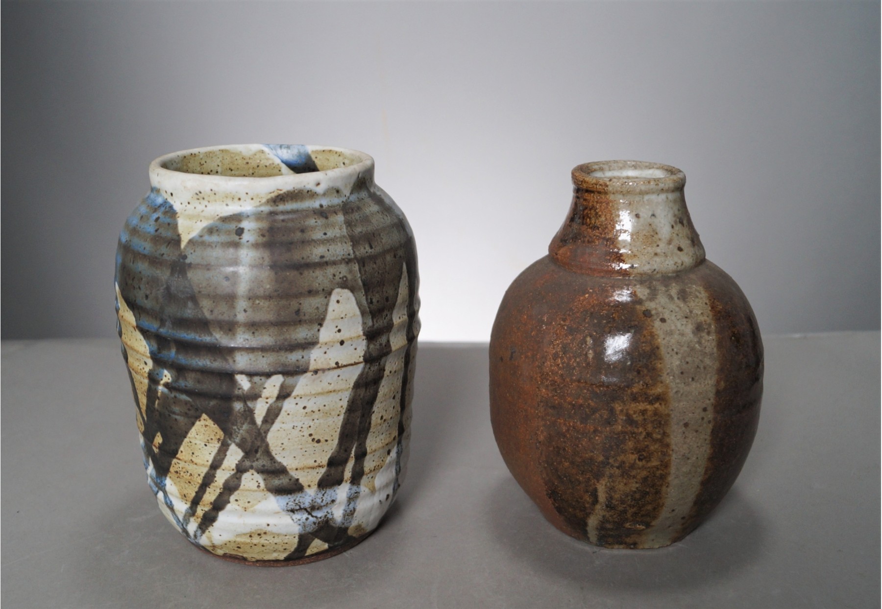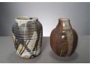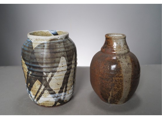 Listed are two hand thrown and glazed earthenware vases. The one on the left measures 7.5" tall with a 3.5" opening and the one on the left measures 7.5" tall and has a 1.5" opening. Both are in very good condition with no chips or cracks. No makers marks. Please see photos for details.