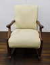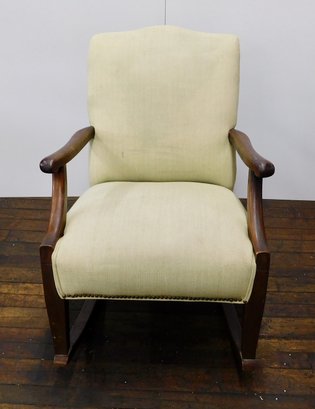 A vintage wooden rocking chair with upholstered seat and backrest.