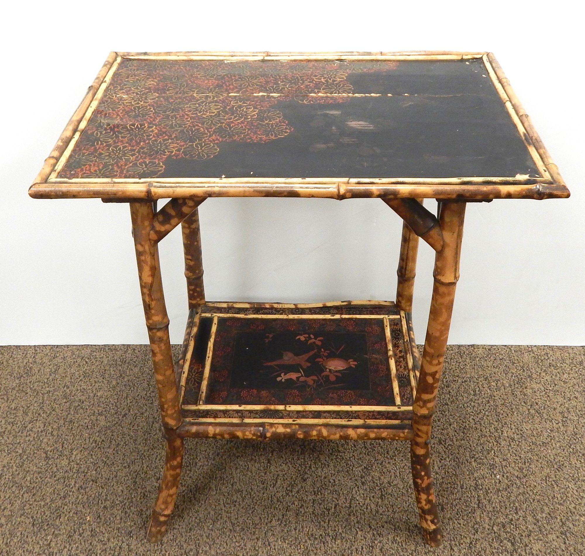 Late 1800's "tortoise shell" bamboo table with hand painted decoration