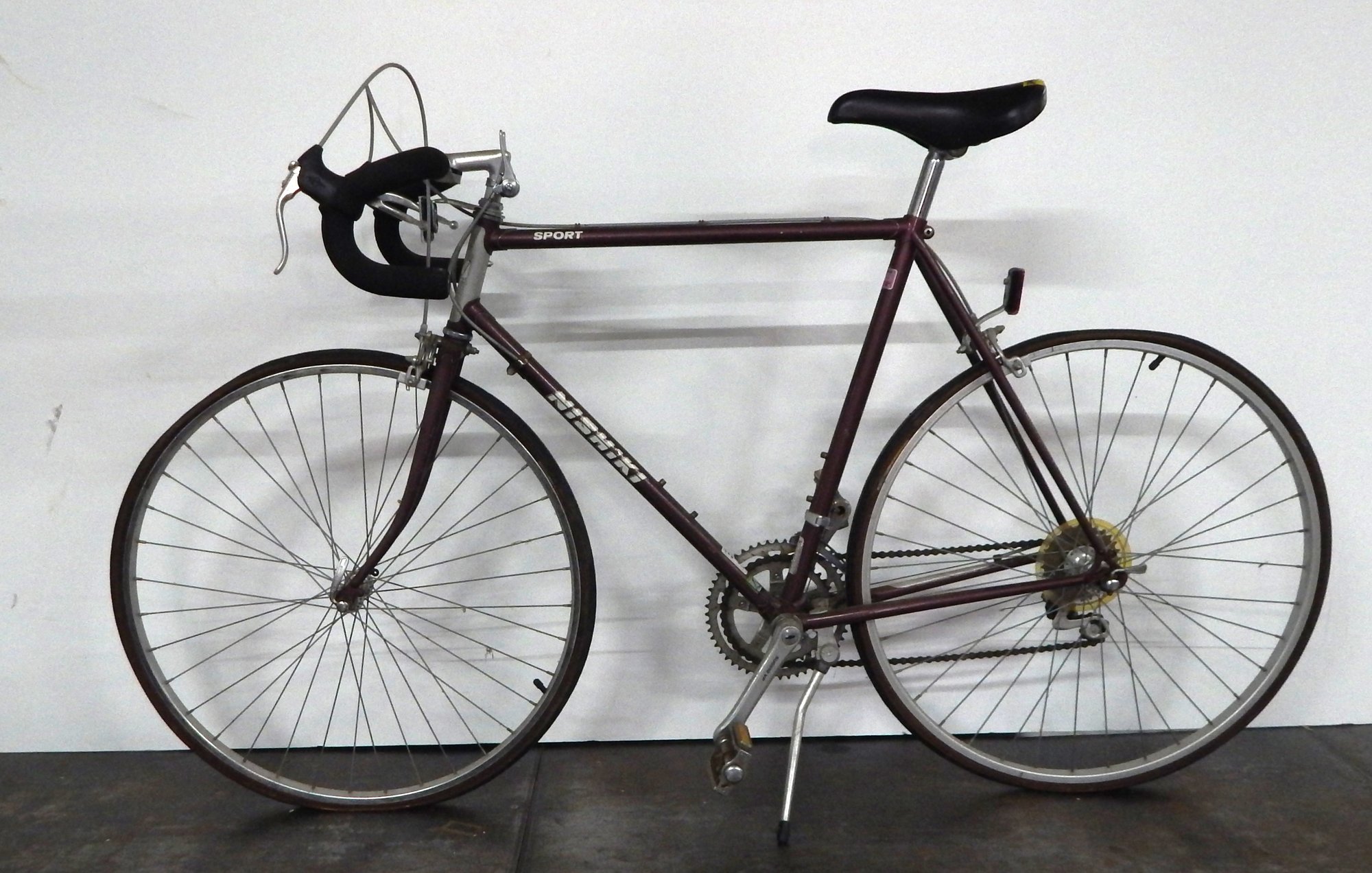 Vintage Nishiki bike, 4130 Chromoly alloy steel frame, deep burgundy color, needs restoration
