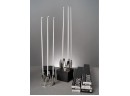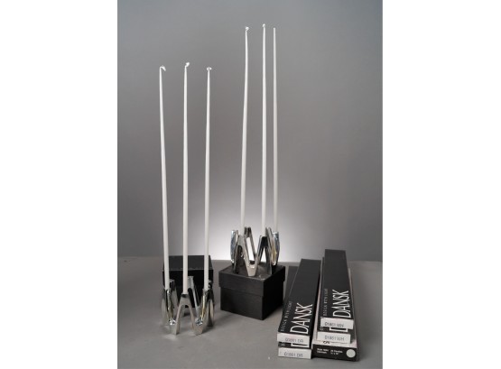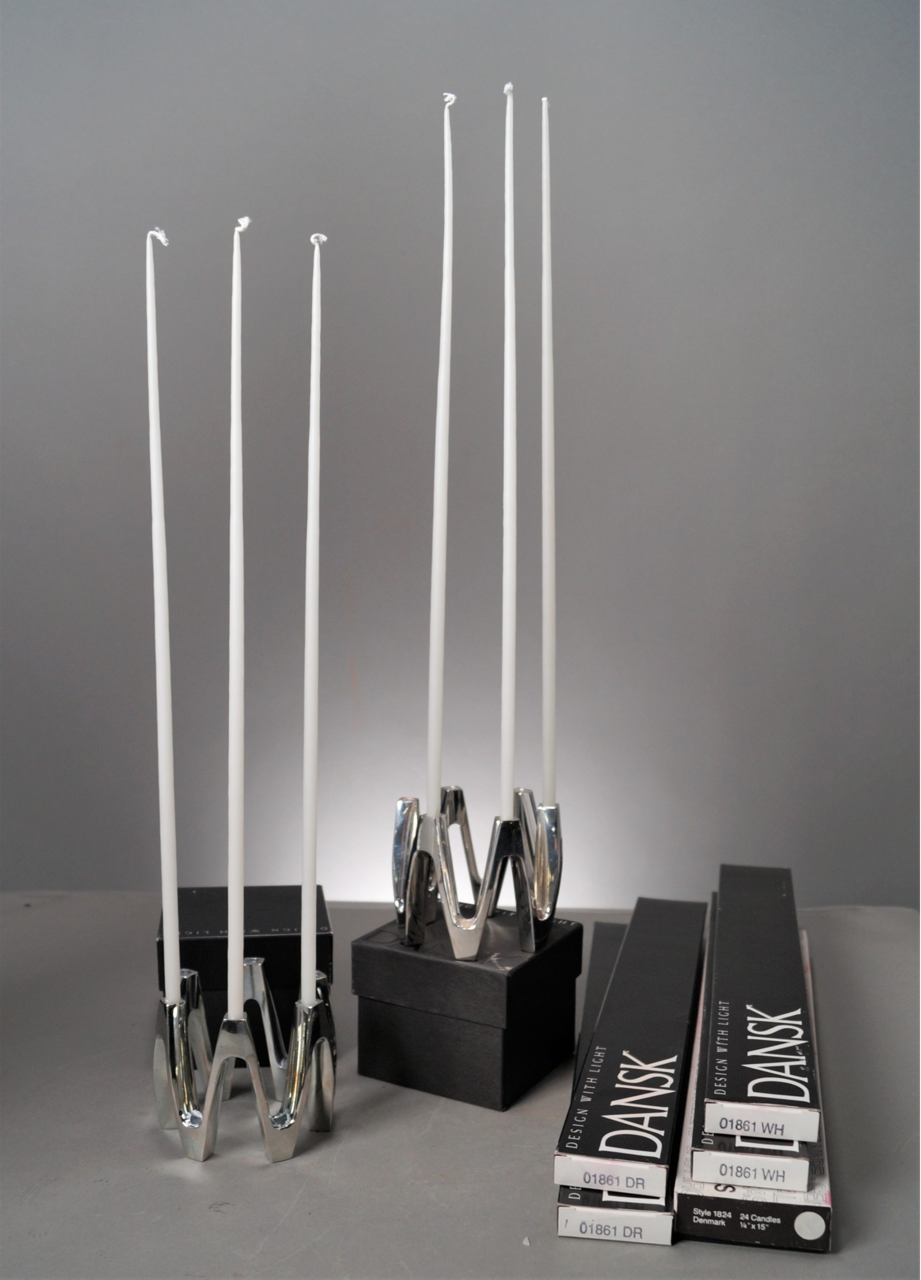 Listed is a pair of silver plate candle holders designed by Dansk founder Jens Harald Quistgaard in 1975. In very good, unused condition. There are 5 boxes of candles - two dark red, 12 candles each, three white, 12 candles each.