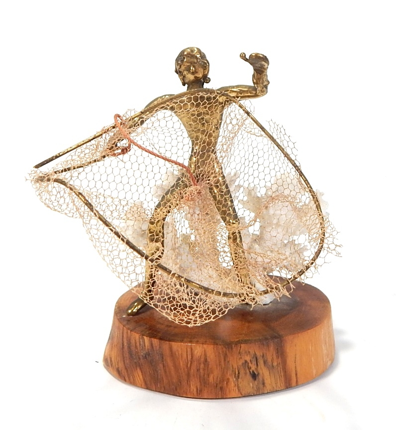 Hawaiian sculpture of fisherman, made of bronze, real coral and wood base.