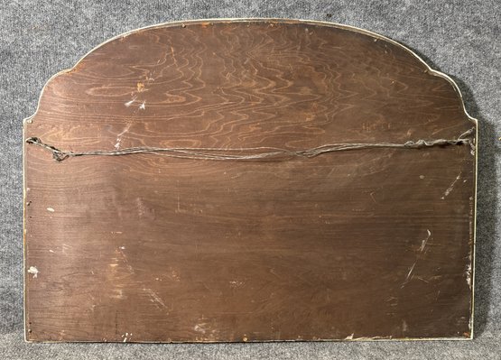 A vintage arched mirror with an off-white painted frame and decorative floral accents in gold paint.