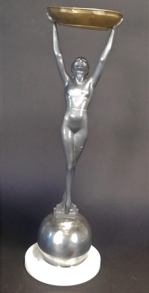 Gray in color, on a ball, on a white base.