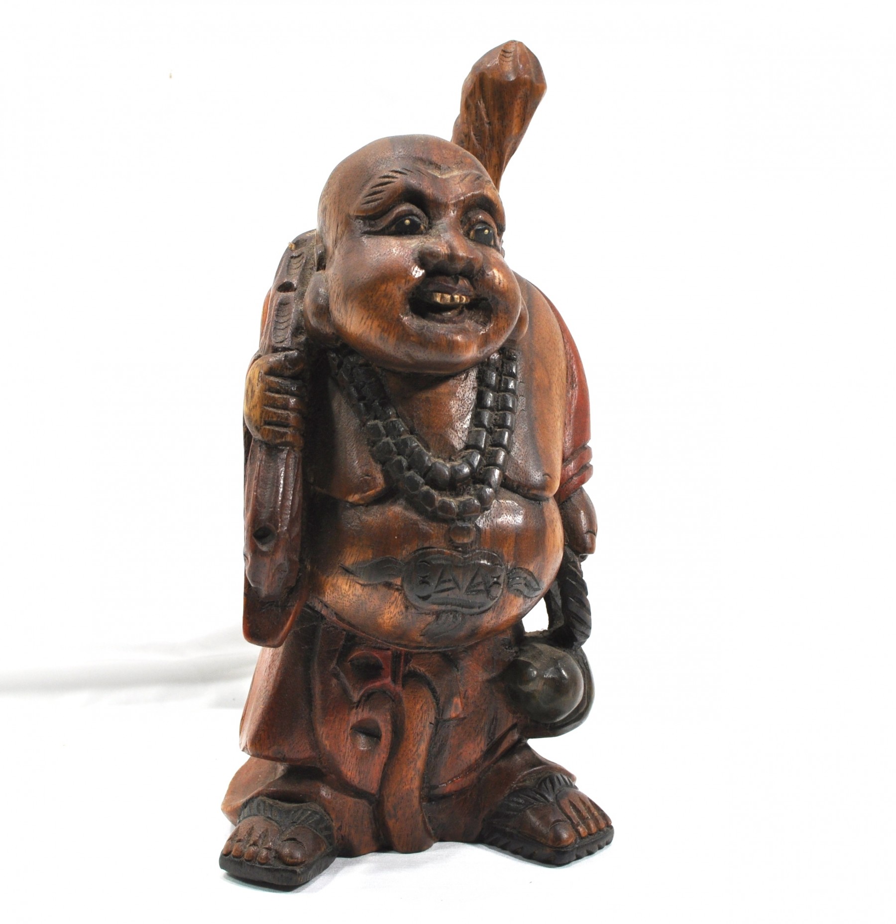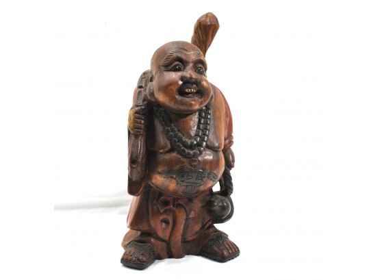 Unusual large carved wood figure of Buddha or monk with painted teeth.