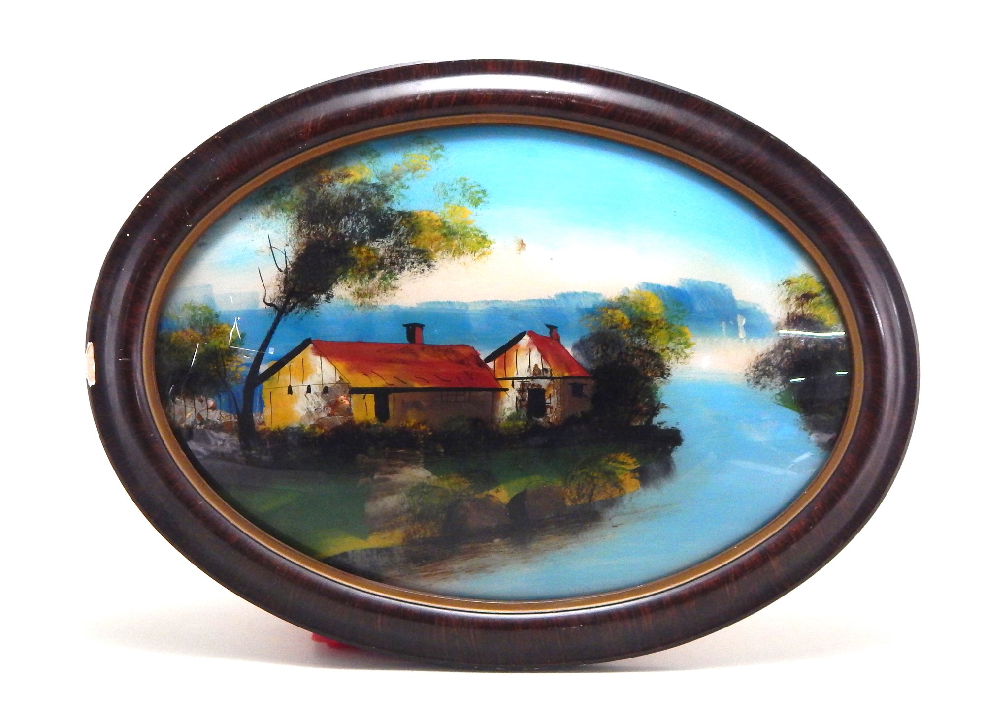 Oval Asian oil painting on glass,