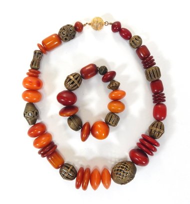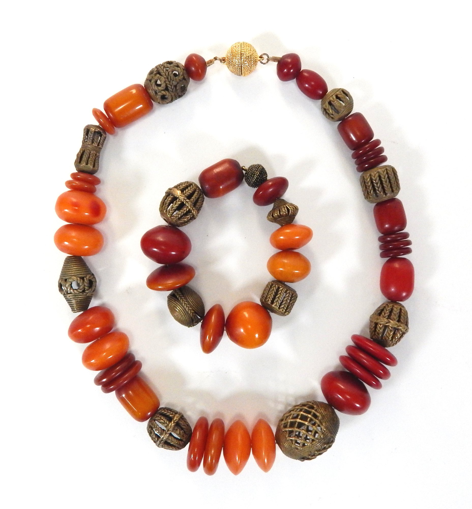 Filigree metal bead and shaped bakelite bead necklace and bracelet.