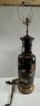 Vintage black vase lamp with gold floral and cloud design. The lamp features a decorative base and top. Includes harp.