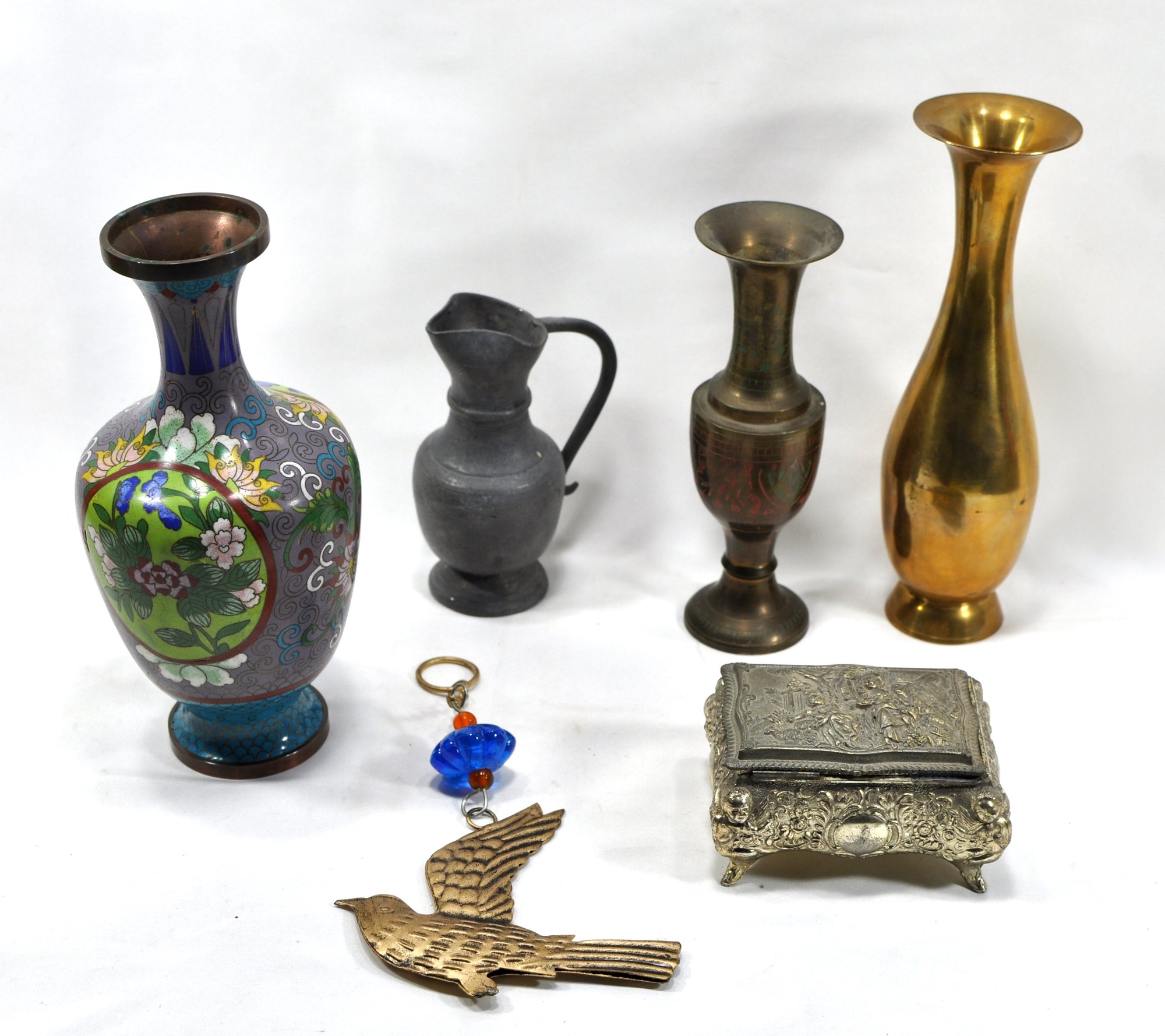 Brass and pewter vases, trinket box with romantic scene on lid, etc.