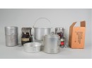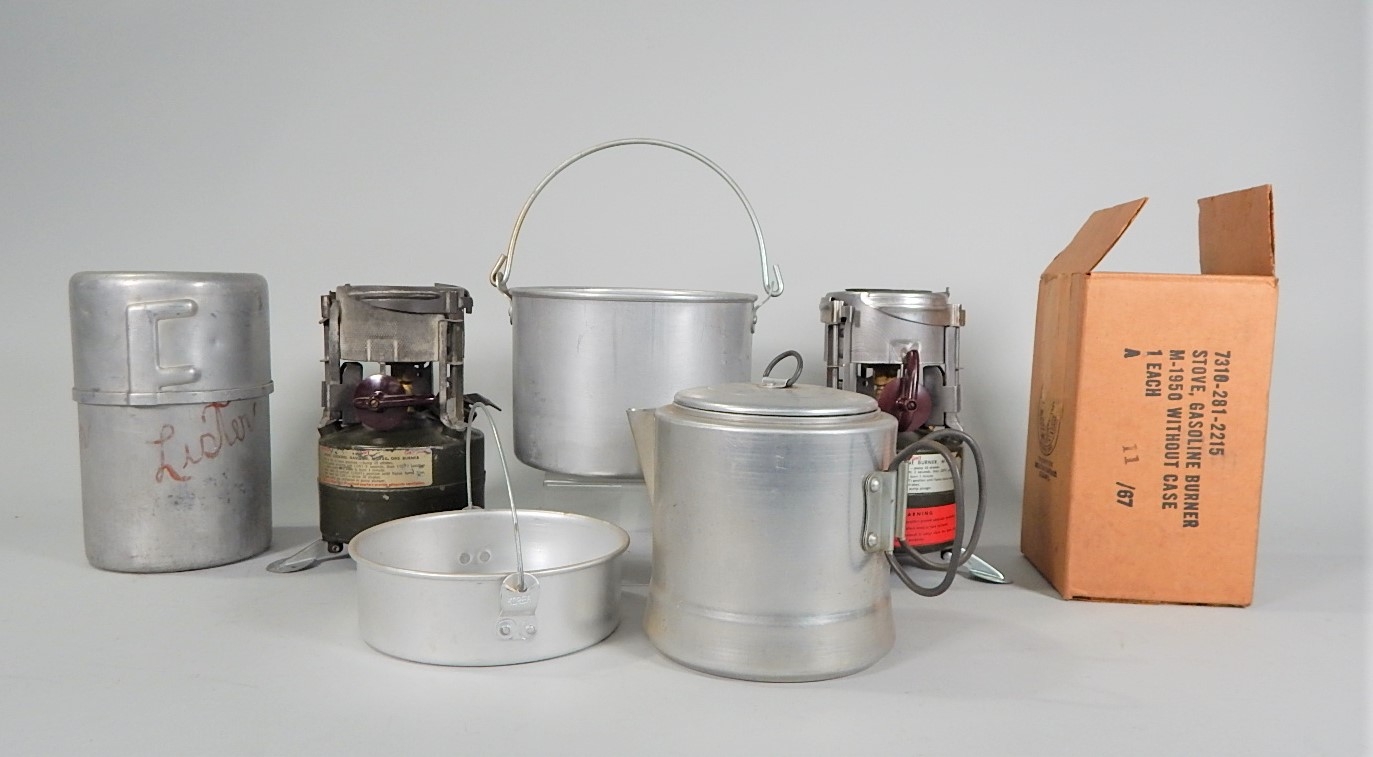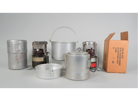 Listed are as follows: Two gasoline fired camp stoves, one issued by the U.S. Army in a metal canister dated 1952, the other in its original box, an aluminum coffee pot and two aluminum pans that nest together. All in good condition, see photos for details.