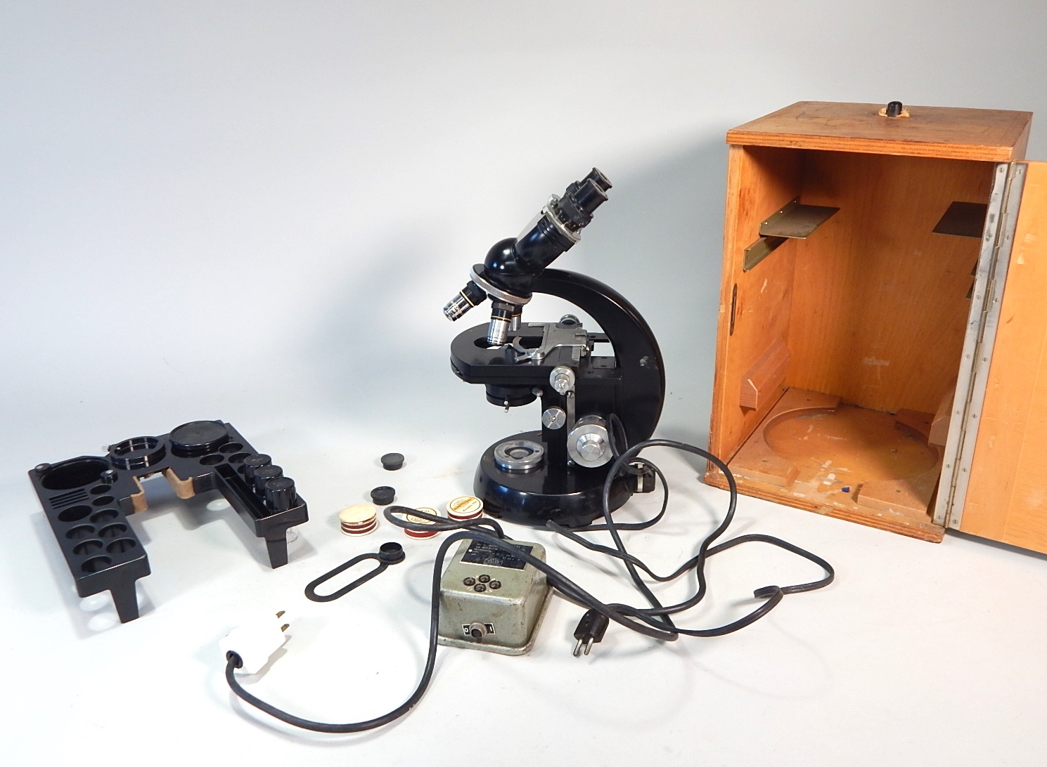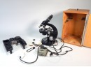 Vintage Carl Zeiss microscope with wooden box, original transformator and some accessories.