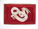 Antique of vintage hand carved bone dragon on plush base with outer copper frame.