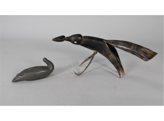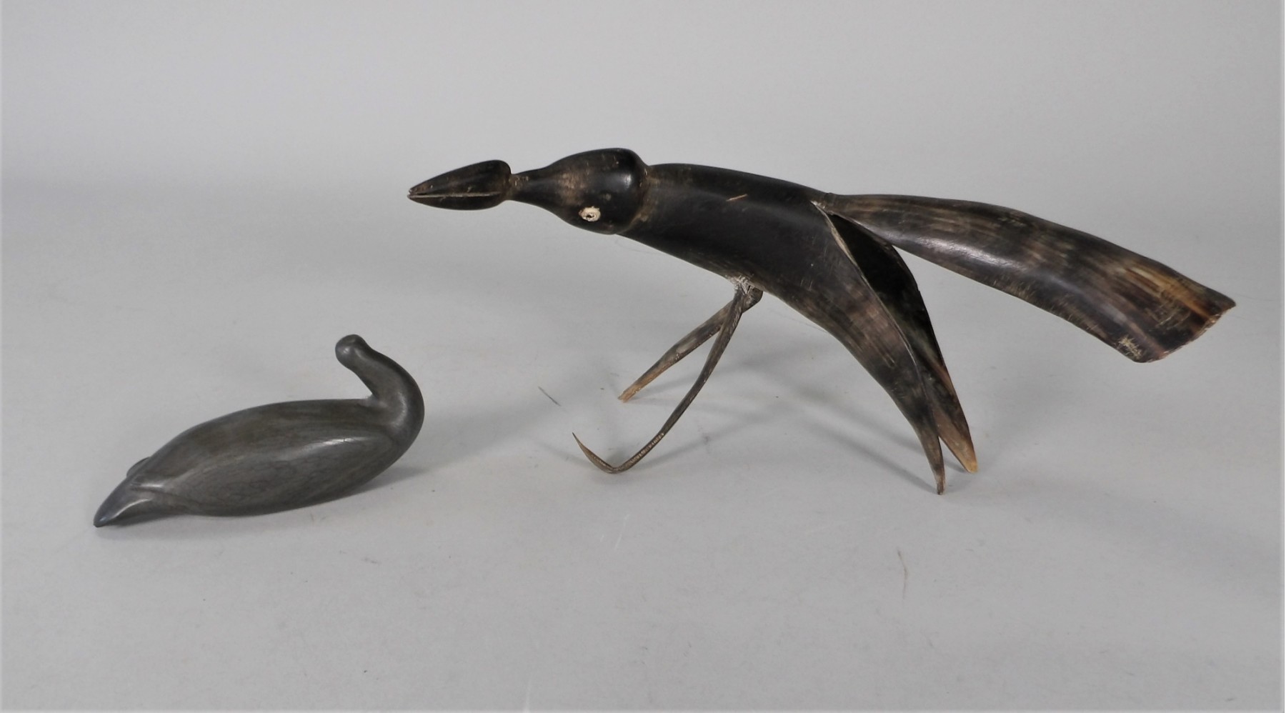 Listed is a bird carved from a horn 10.5"l x 4.75"h. There are a few condition issues - the right foot is broken off and there is a crack on the back of the tail feather.