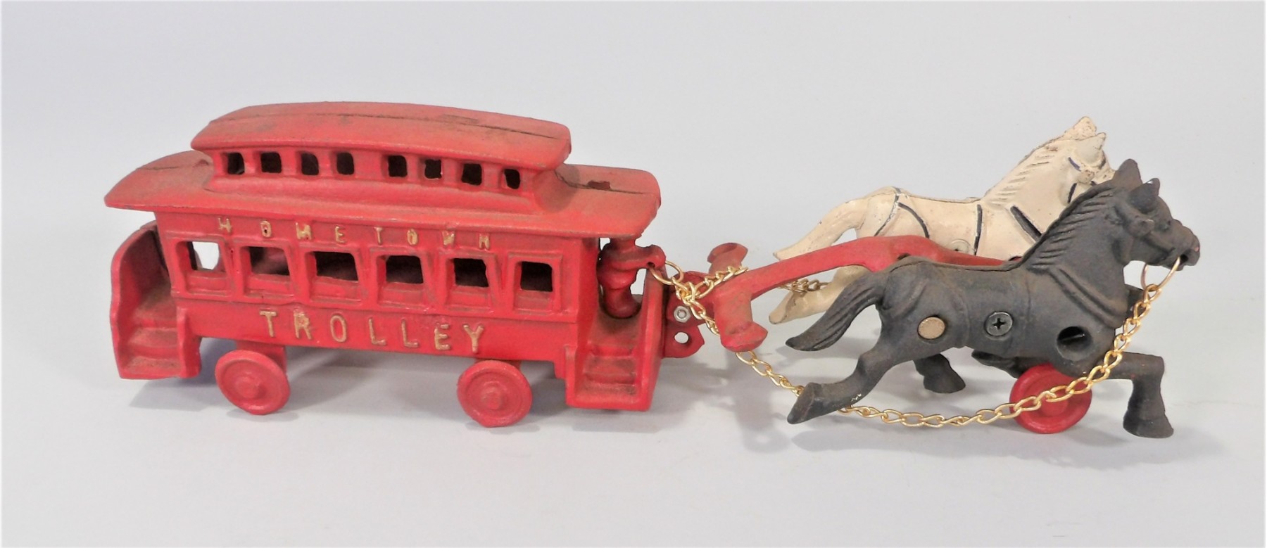 Listed is an old cast iron trolley lead by 2 horses -15"length and 4"tall. It is in very good used condition. See photos for details.