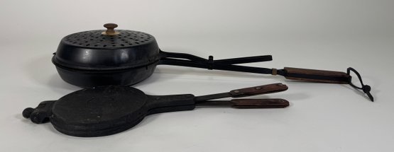 A lot containing two vintage cast iron cooking implements: a hinged waffle iron and a small, perforated dome-lidded pan, both with wooden handles. The largest item measures approximately 23 inches in length and the total weight is 124.4 oz.