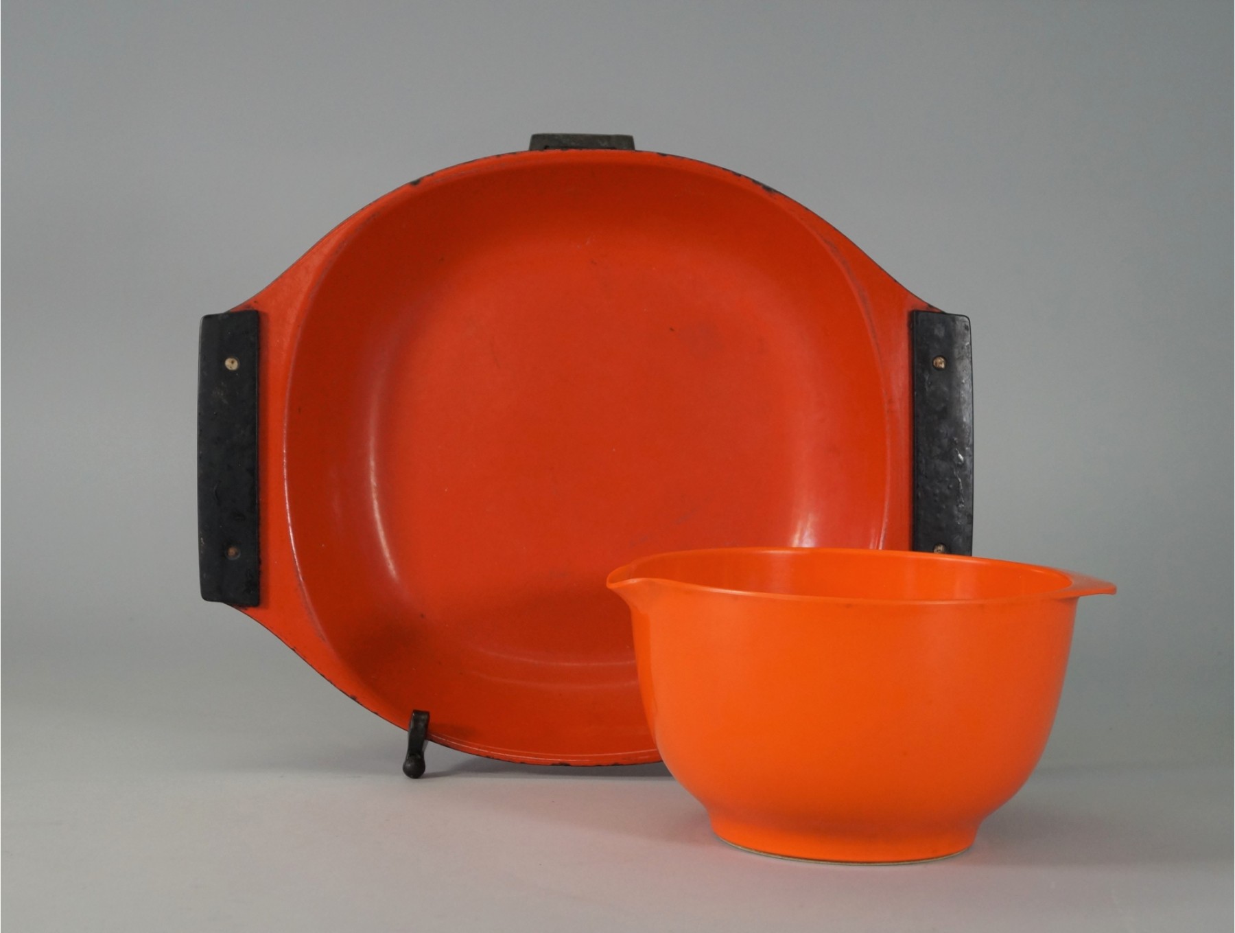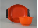 Listed is a vintage deep orange Catherineholm Holland enamel casserole. It measures 16.25" long and 13" wide. Also is an orange Rosti melamine mixing bowl, 5"h x 8.5" wide. Both have wear. See photos for details.