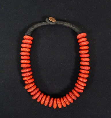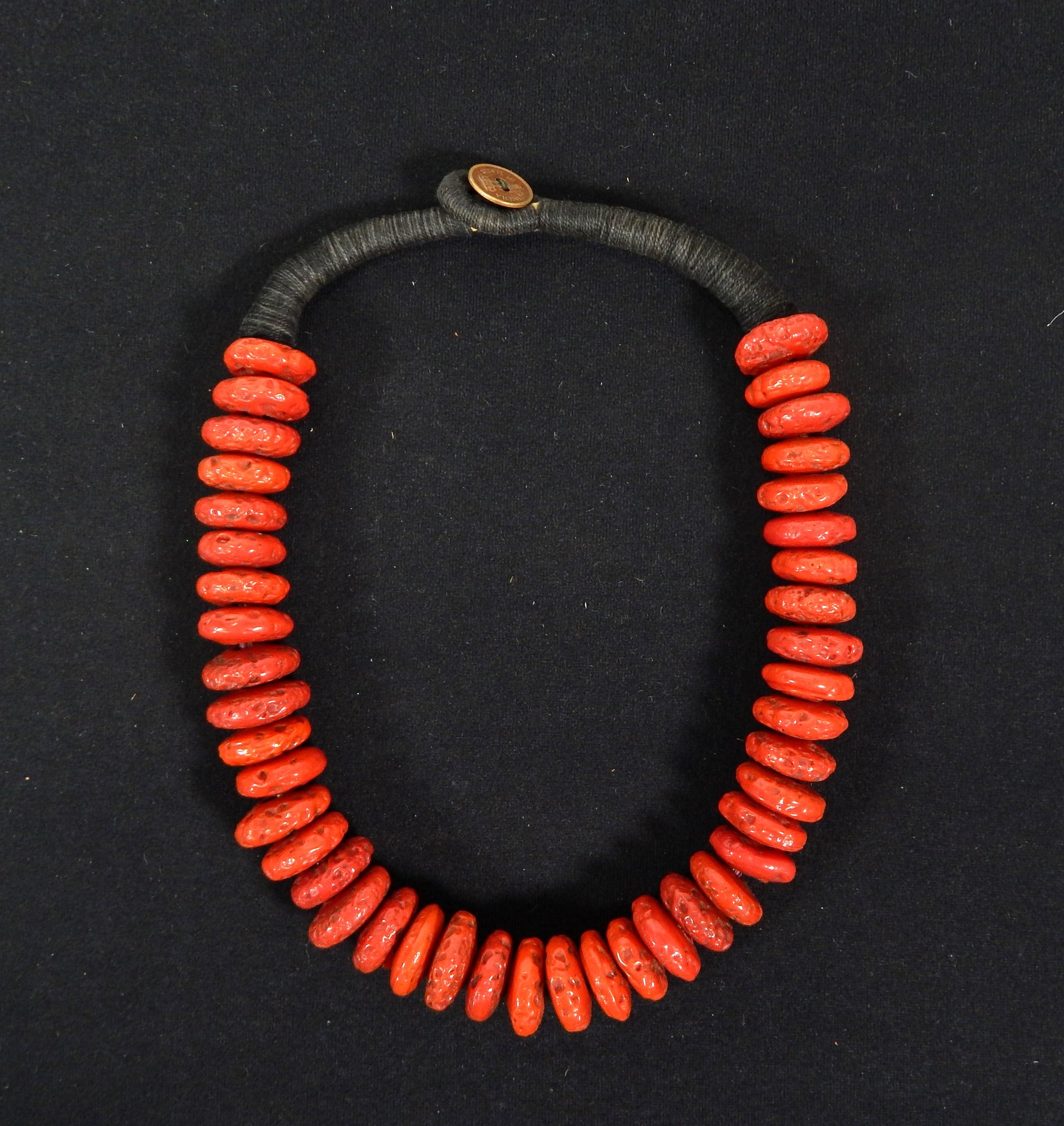 Heavy necklace with red ceramic bead imitating coral, coin closure.