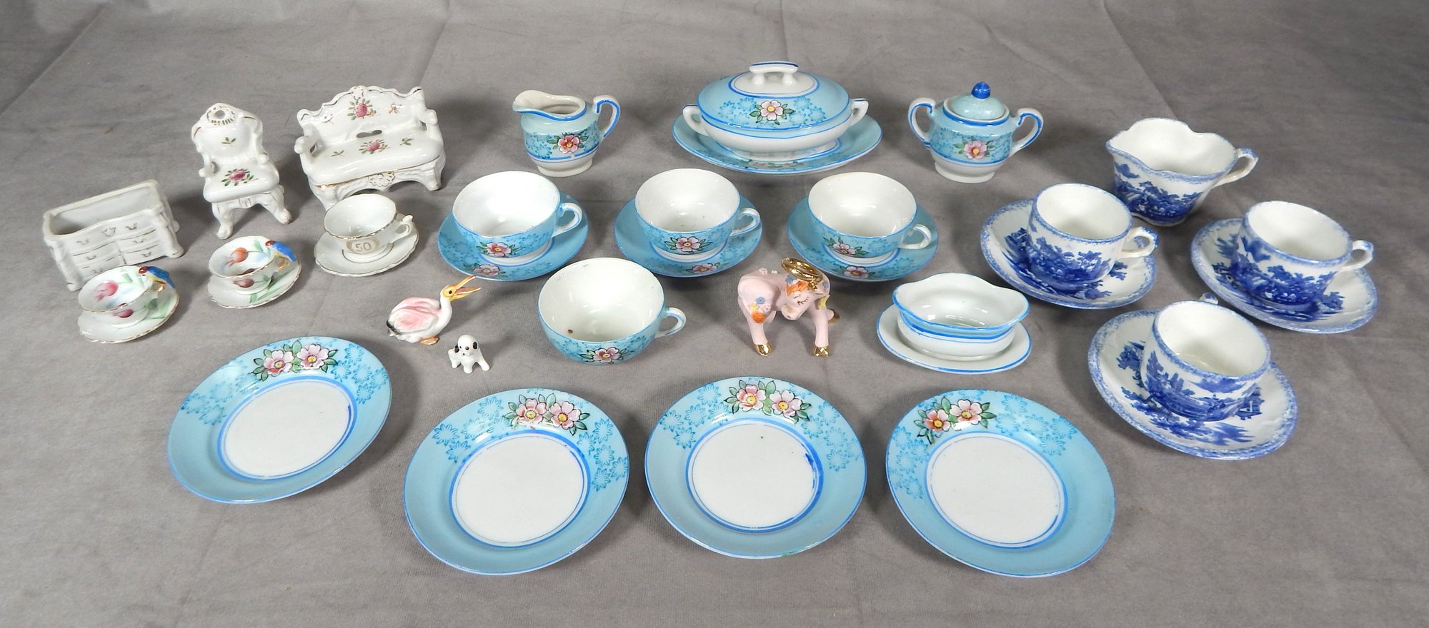 Child's c. 1940's turquoise and white with pink flowers tea set, one saucer is missing