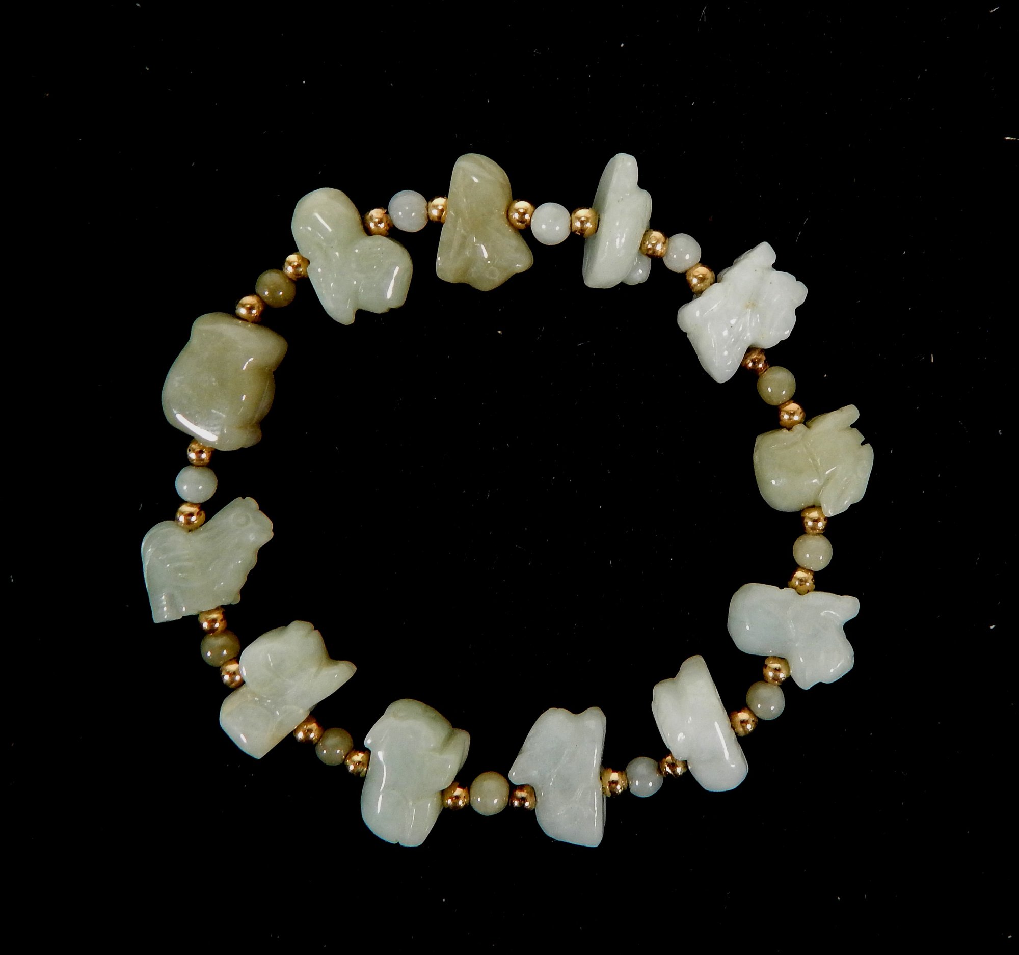 Jade bracelet with carved animal figures, gold or gold tone spacers.