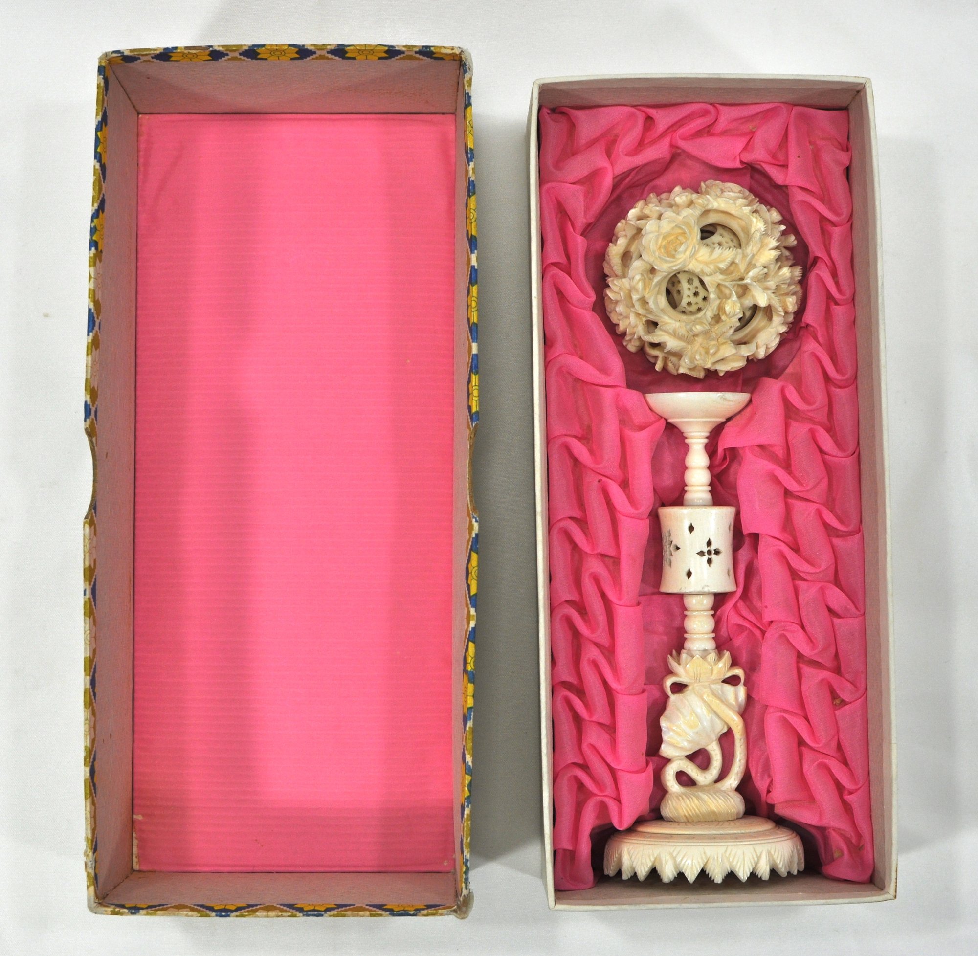 Hand carved Chinese puzzle ball on column stand with original box with attached label.