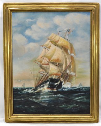 Beautiful original oil painting on board of clipper ship with sails.