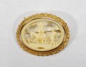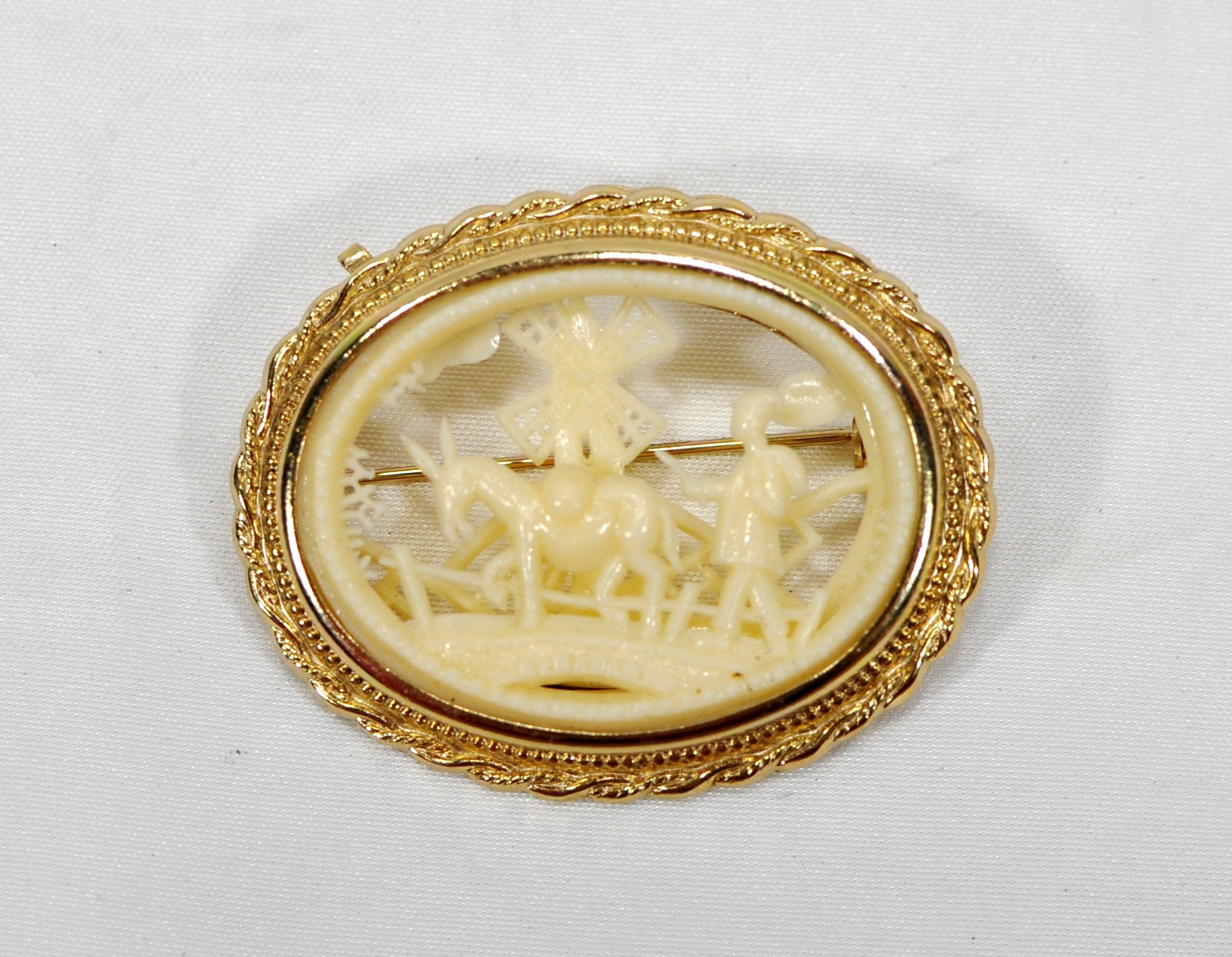 Carved celluloid scenic pin farmer, horse, windmills.