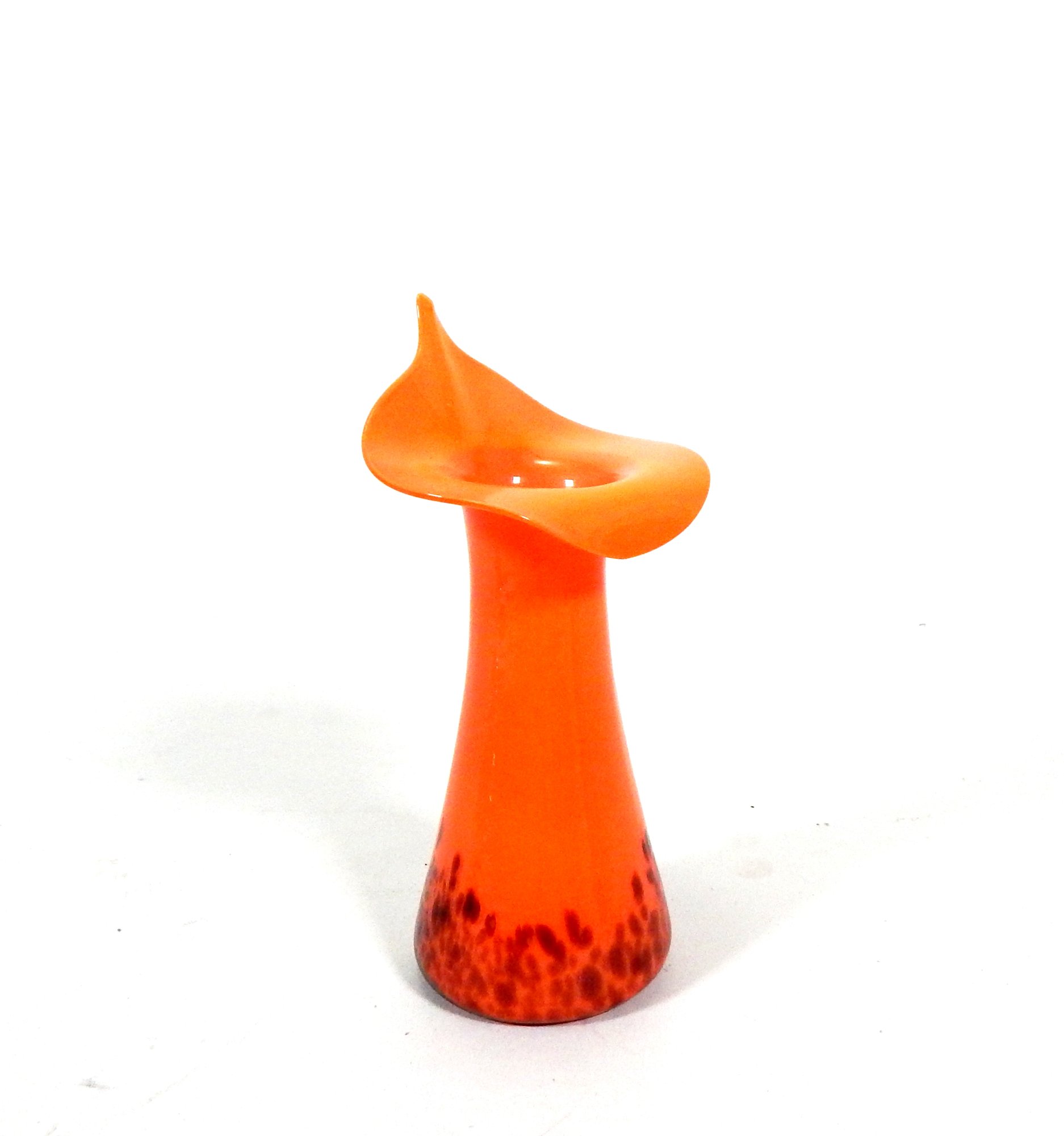 Beautiful vintage 1930's Czech glass, orange blown glass jack-in-the-pulpit vase, with a brown speckled Spatter glass base.