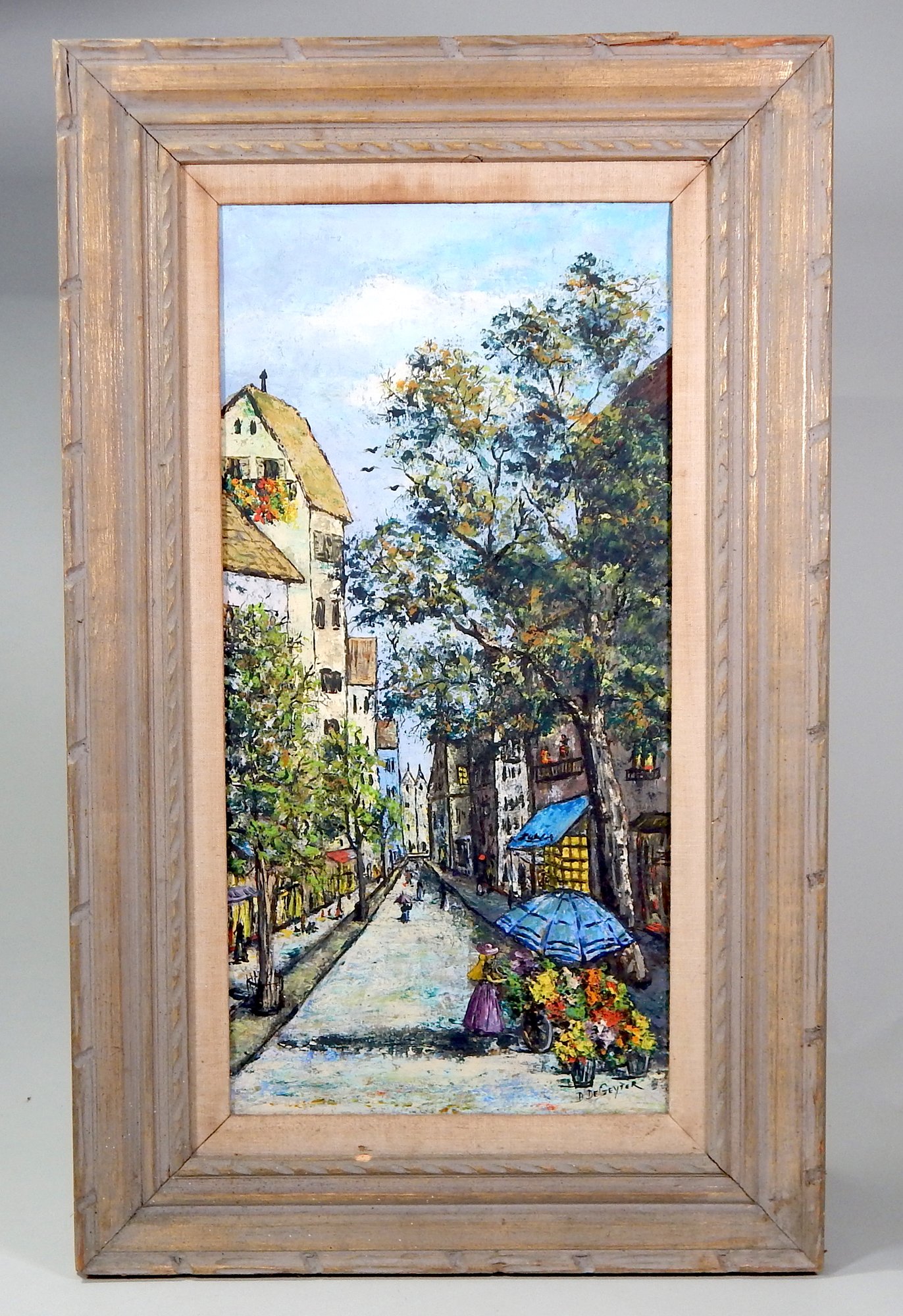 Attractive oil on canvas painting depicting a girl selling flowers, signed lower right.