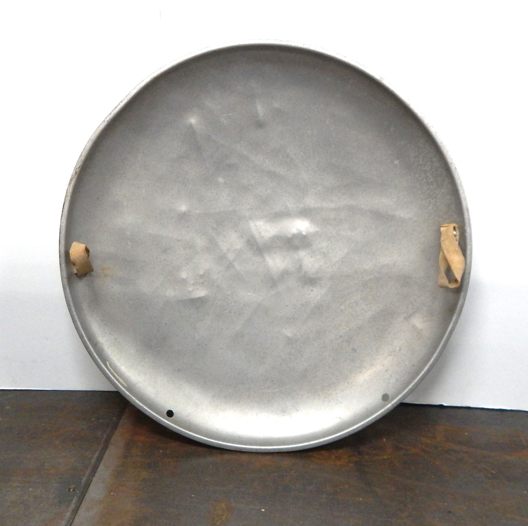 Aluminum saucer with 2 intact handles. Measures 26"across. Dents and scratches consistent with use.