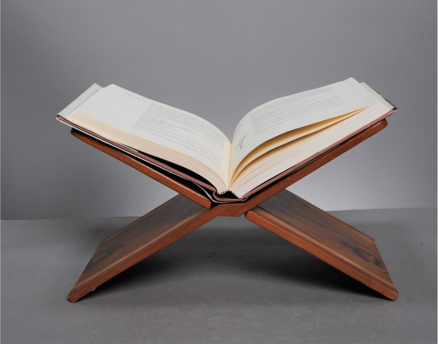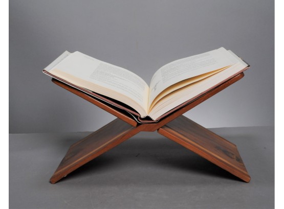 Listed is a vintage folding book holder that appears to be carved from a single block of wood. When flat, it measures 15.75"l x 8.5"w. Book not included.