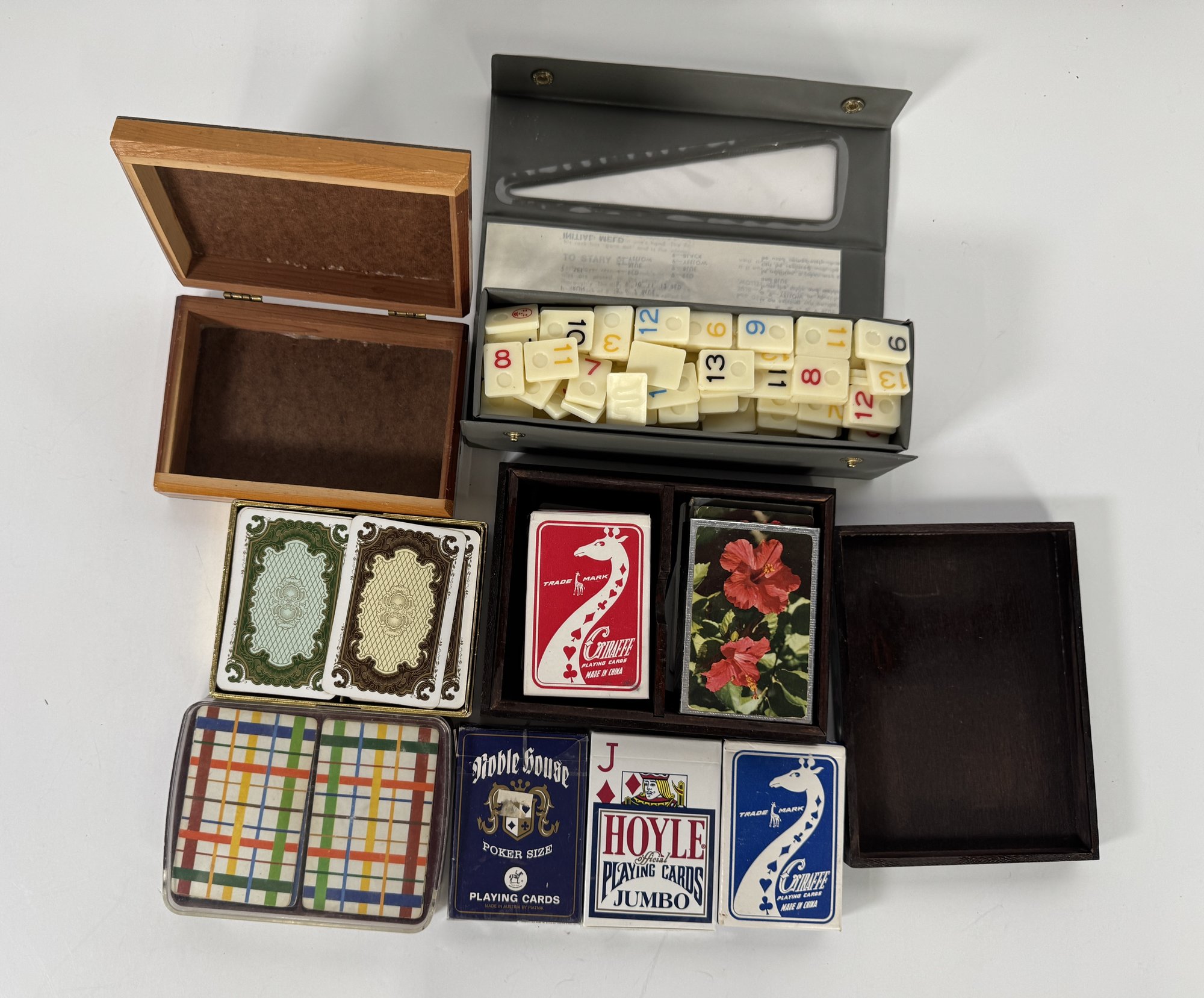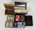 Collection of various games and playing cards, including Scrabble tiles, several decks of cards with varying designs, and a backgammon-style game. Items are in their original boxes or cases where applicable. The largest item measures approximately 9.5 inches in length and weighs 71.4 ounces.
