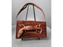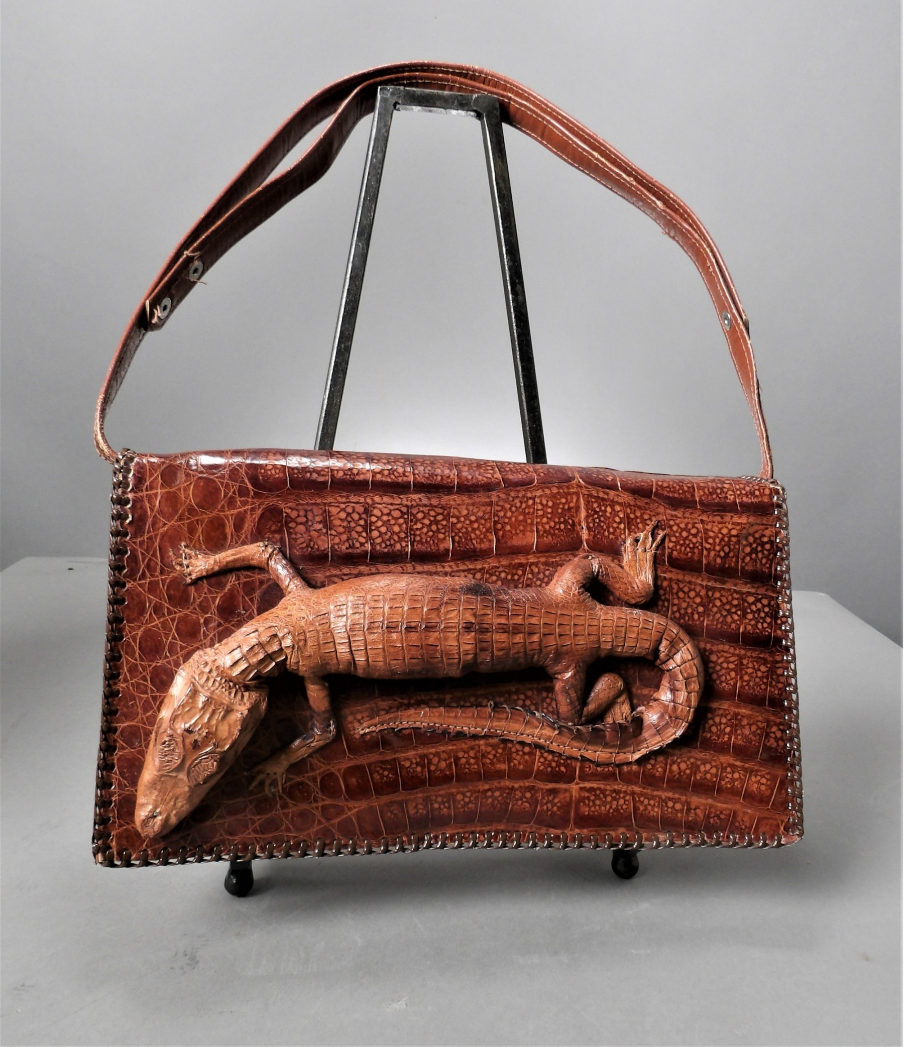 Listed is an alligator handbag with a gator attached to the front - 11" w x 6"h x 3"d. There is a little bit of wear along the edge of the shoulder strap and the leather itself is a bit stiff, but overall, the bag and the gator sewn onto the front are in very good condition. See photos for details.