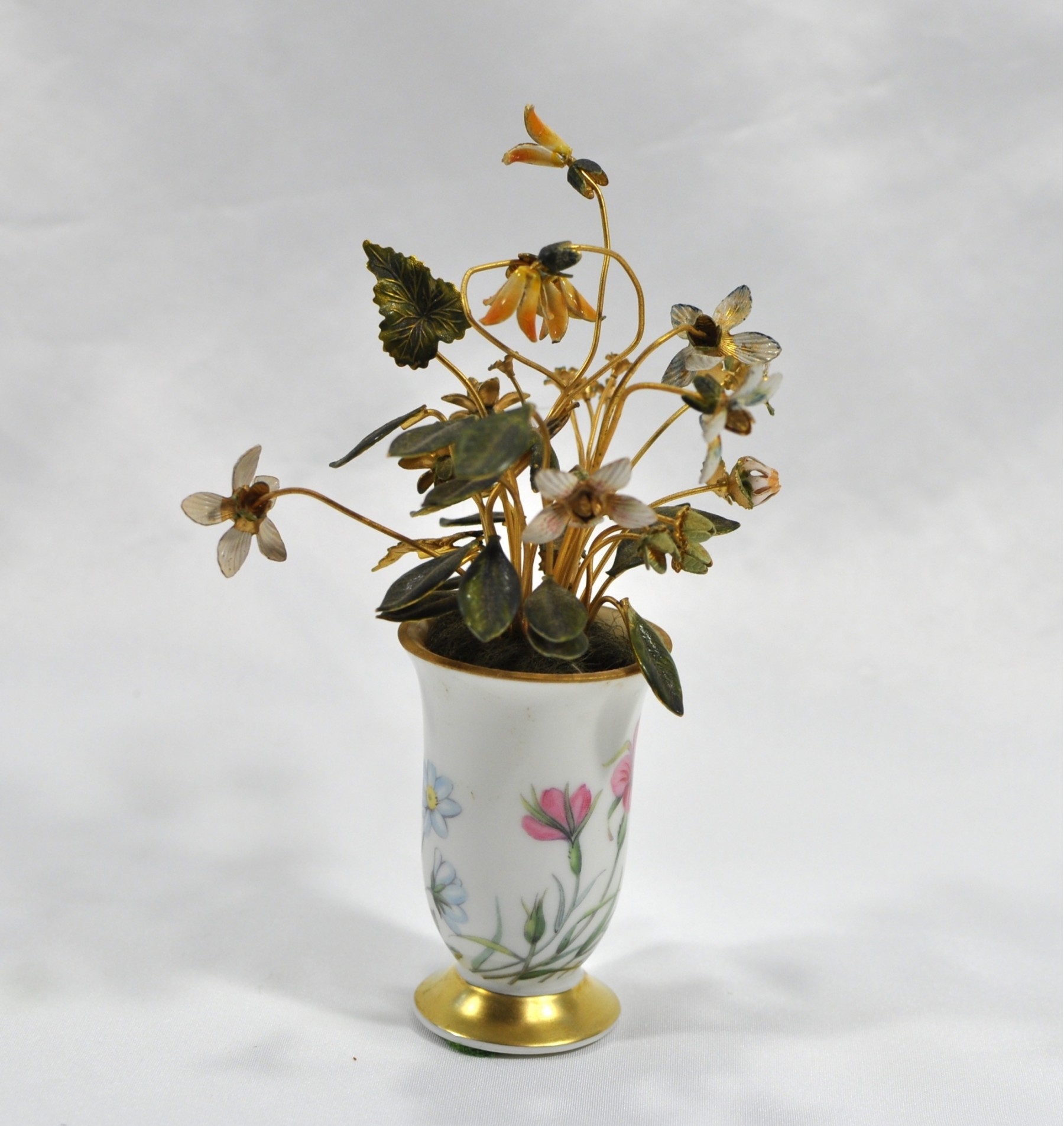 Vintage porcelain vase with metal enameled flowers.