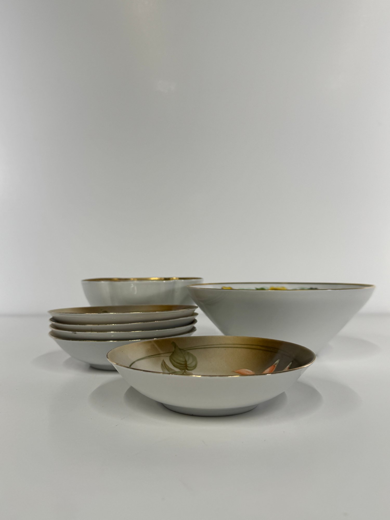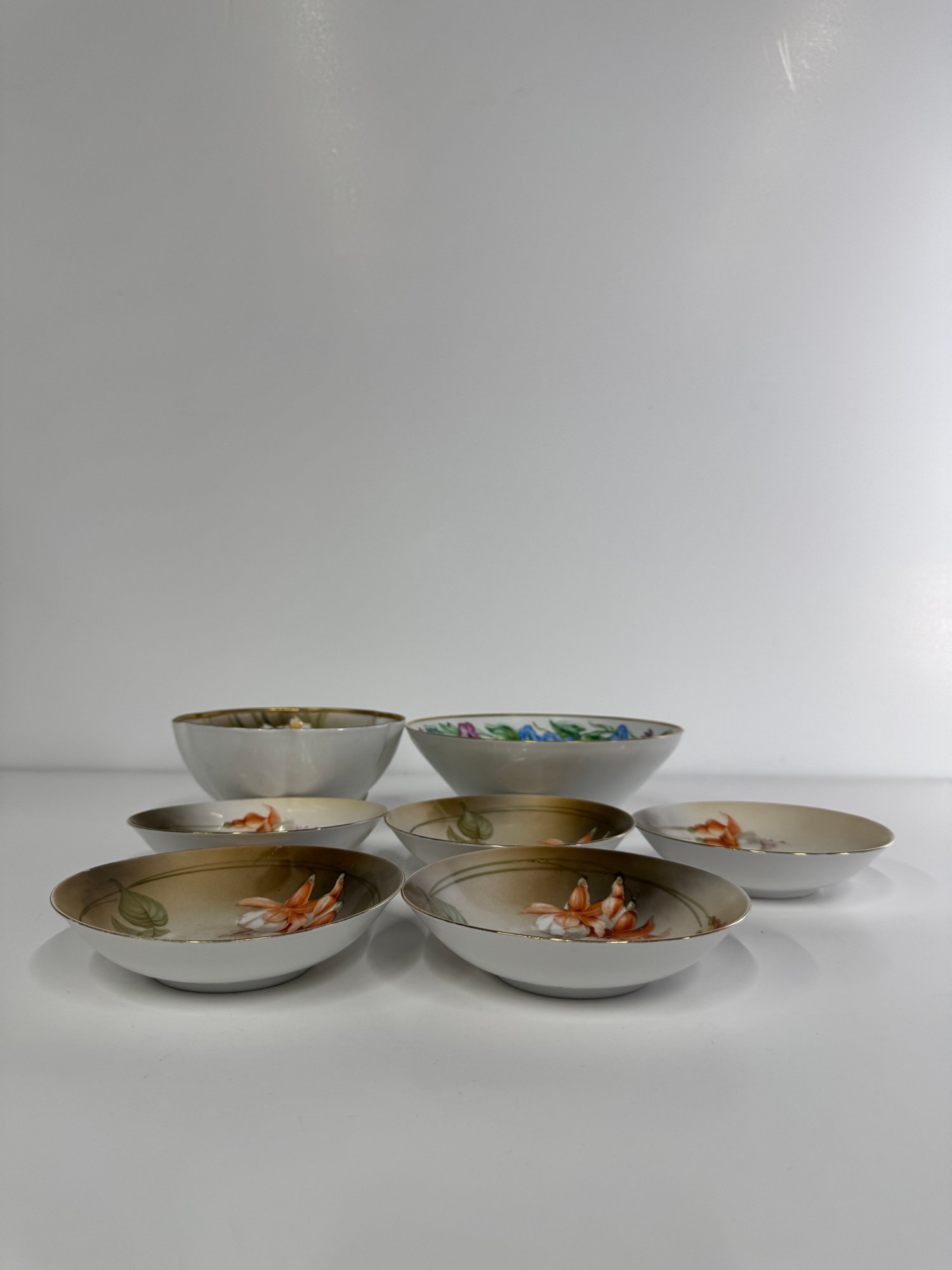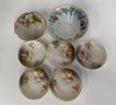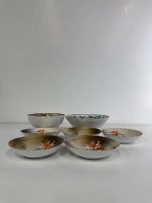 A collection of vintage German porcelain bowls featuring hand-painted floral designs.
